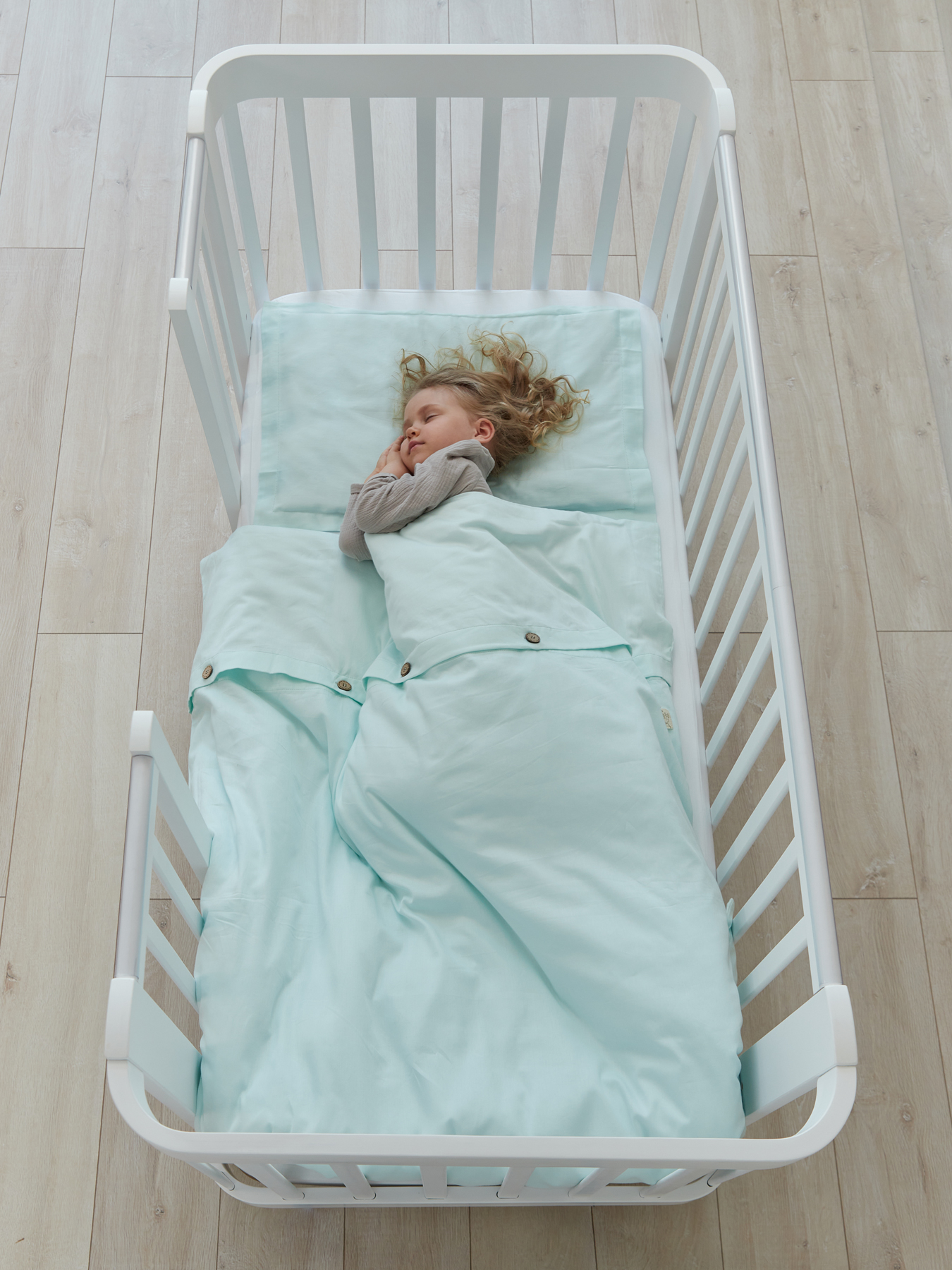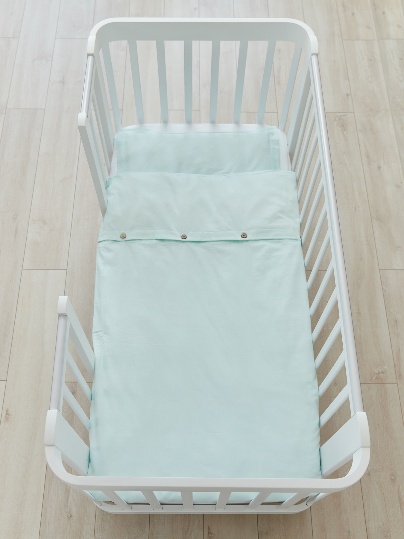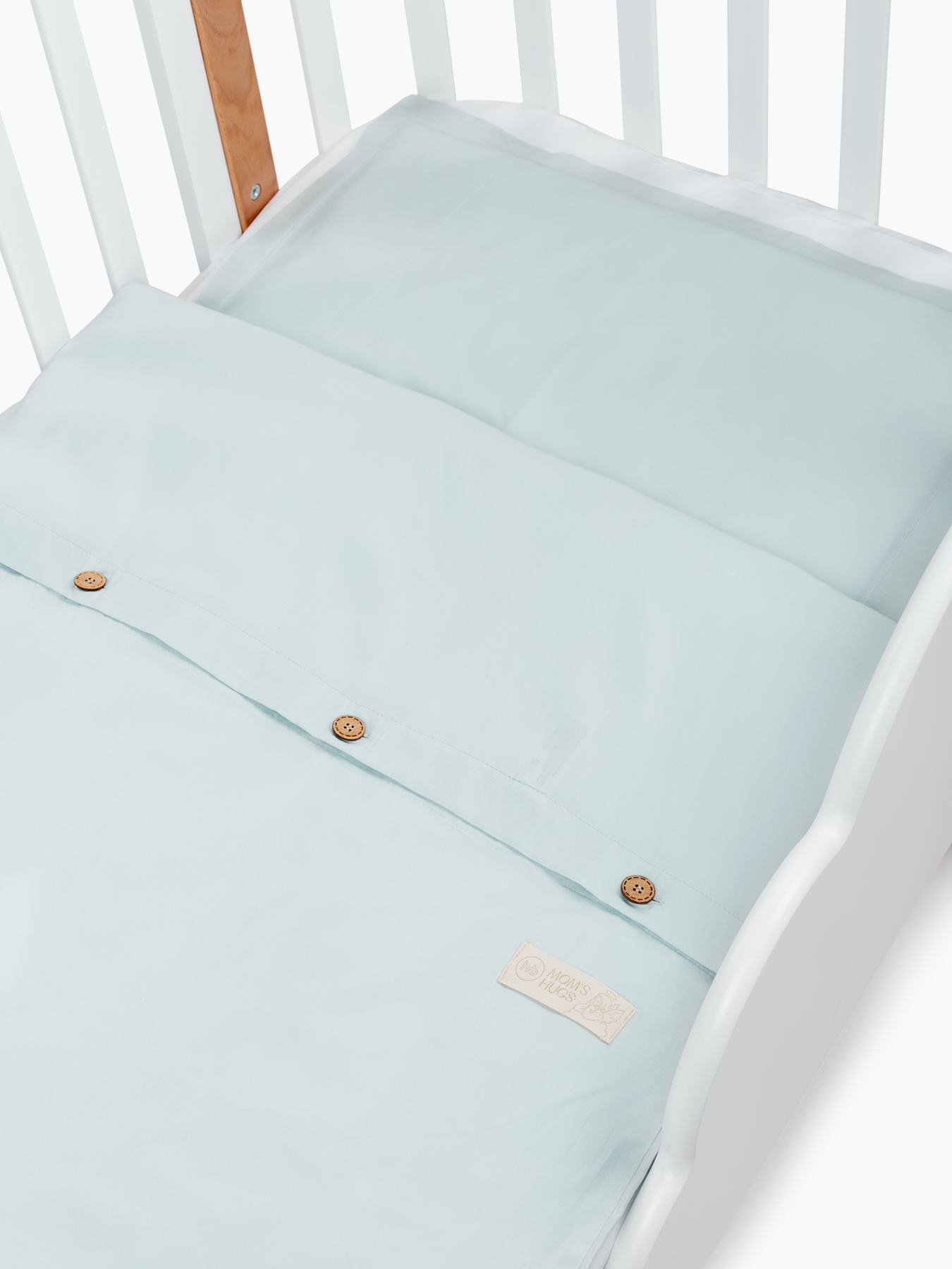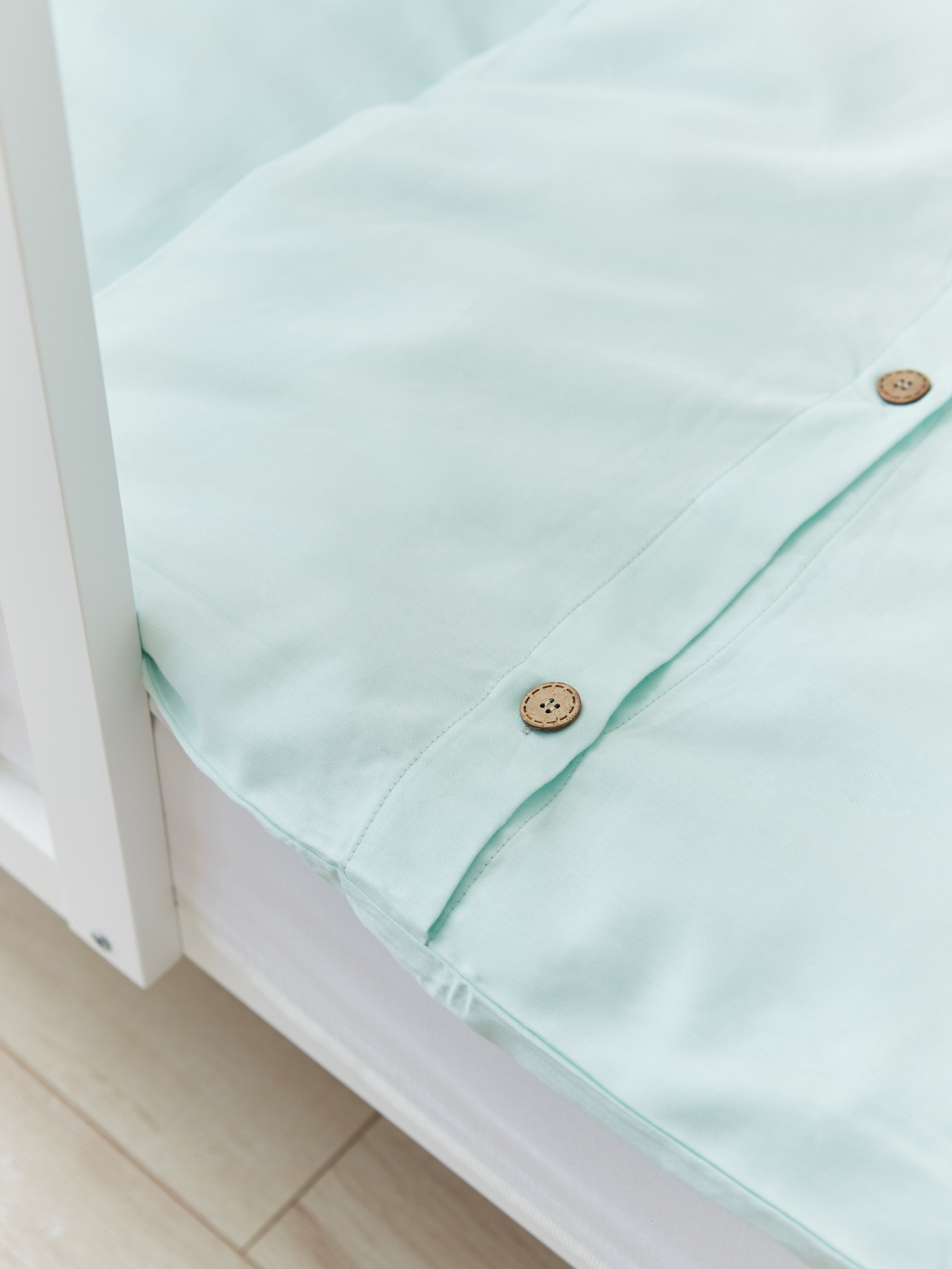 The bed linen is made of satin, which is based on 100% cotton in a plain weave, so the linen is super durable and super soft. The hypoallergenic material breathes and wicks away moisture well. The set includes a pillowcase and duvet cover. The duvet cover is fastened with buttons – it is convenient to tuck in the blanket, which will not come out during use. The laconic design will fit perfectly into the interior of a children’s room.