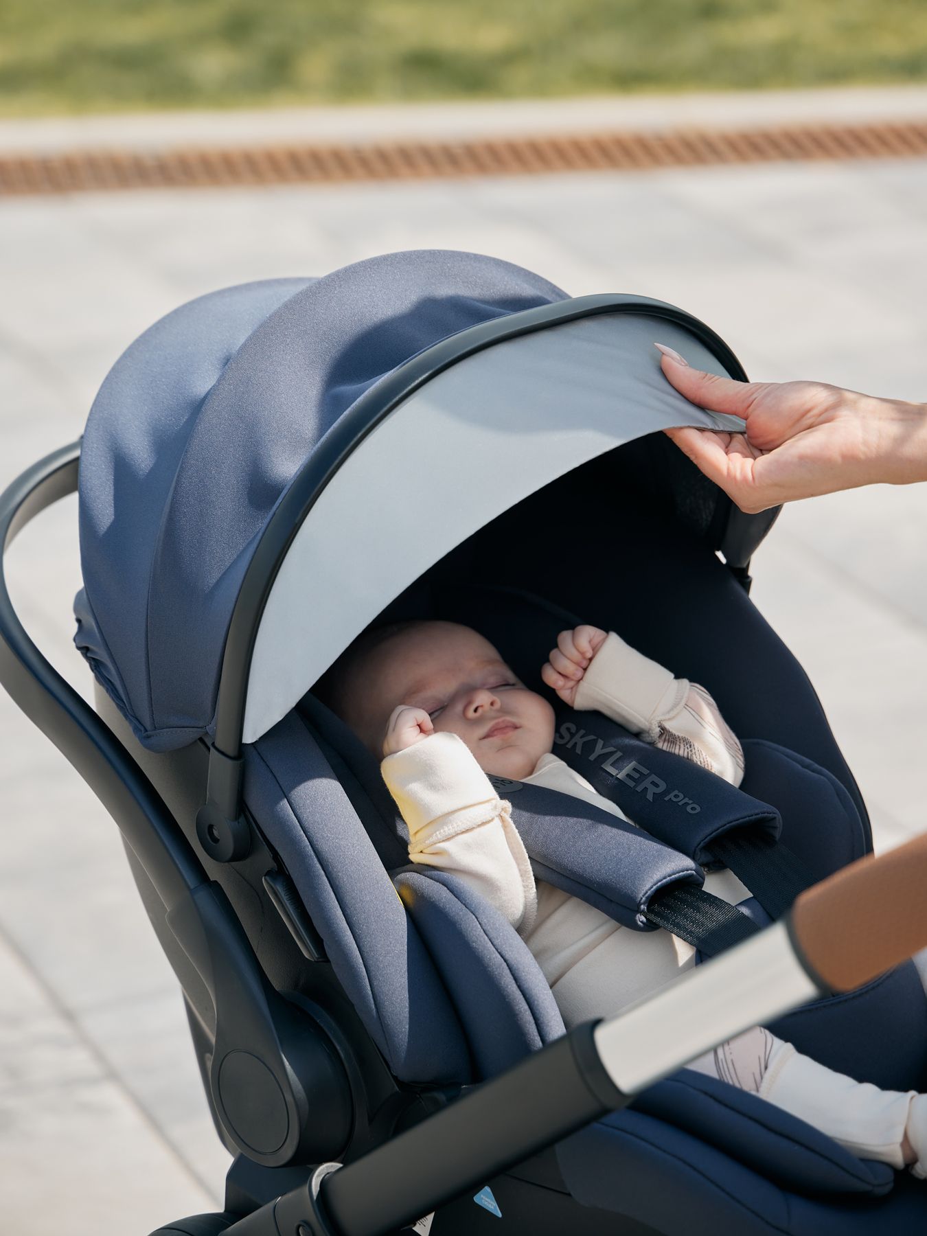 The exquisite SKYLER PRO car seat is an indispensable assistant for a mother in the first year of a child’s life. Thanks to the possibility of attaching a car seat to the chassis of the MOMMER PRO, MOMMER and LINDA strollers, mothers can maintain an active lifestyle and travel with their baby more often. The elegant lines continue with the soft, anatomical liner design that provides extra comfort during your ride. The folding hood will protect the baby from the sun, and the comfortable handle allows you to carry it without any extra effort, just like in a regular cradle. When creating SKYLER PRO, we paid increased attention to safety, so the infant carrier has reliable side protection and three-point belts with soft pads for greater child comfort. Thanks to the semicircular base, it is convenient to rock the baby; you can use the carrying handle as a rocking limiter, lowering it all the way down. The car seat is secured in the car using standard seat belts and installed against the direction of travel of the car.