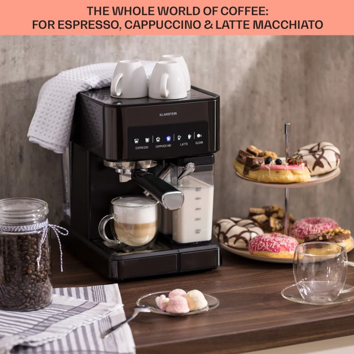 For passionate coffee lovers: the Klarstein Arabica Comfort espresso machine can prepare delicious espresso, cappuccino and latte macchiato at the touch of a button. Thanks to the 90° stainless steel frothing nozzle and the removable milk tank, you can individually control the milk foam production. In addition, you can brew ground coffee or use a practical coffee capsule. Thanks to the removable water tank and shooting filters, cleaning the device is simplified.