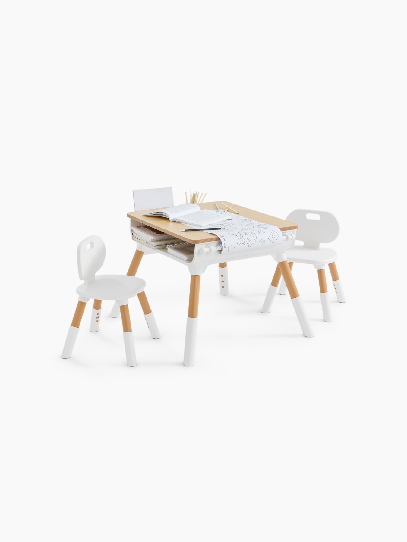 Children’s set LITEN DUO – a growing table and two chairs for children from 1 year. The furniture is height adjustable, ensuring correct posture. The table is equipped with an organizer, a paper roll holder and a safe tabletop without sharp corners. Compact and durable design fits perfectly into any room. A special feature of the set is that it can be used by two children at the same time. For convenience, there are two open niches under the tabletop on two opposite sides: each child has his own separate area for storing things.