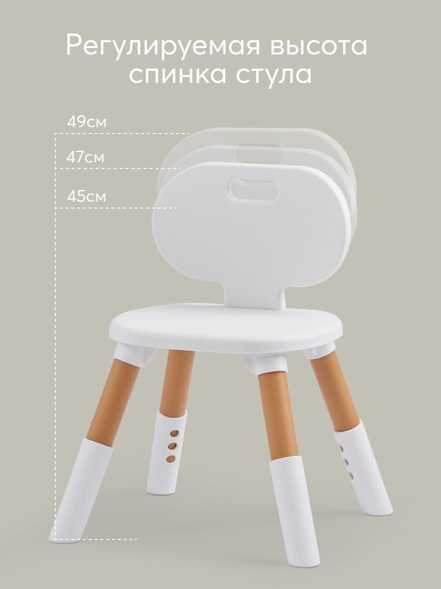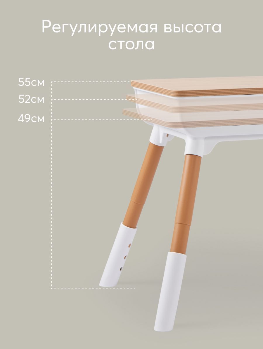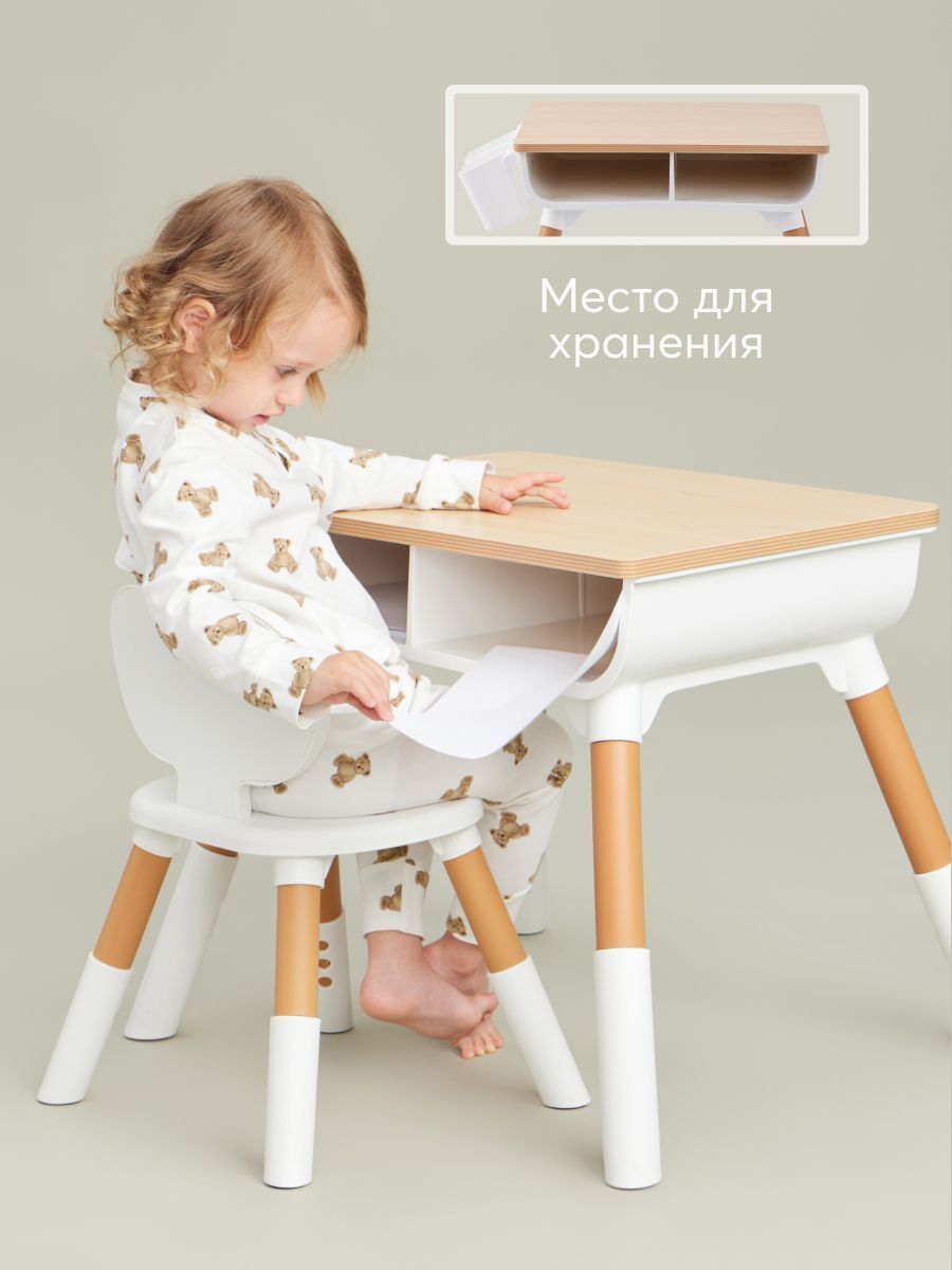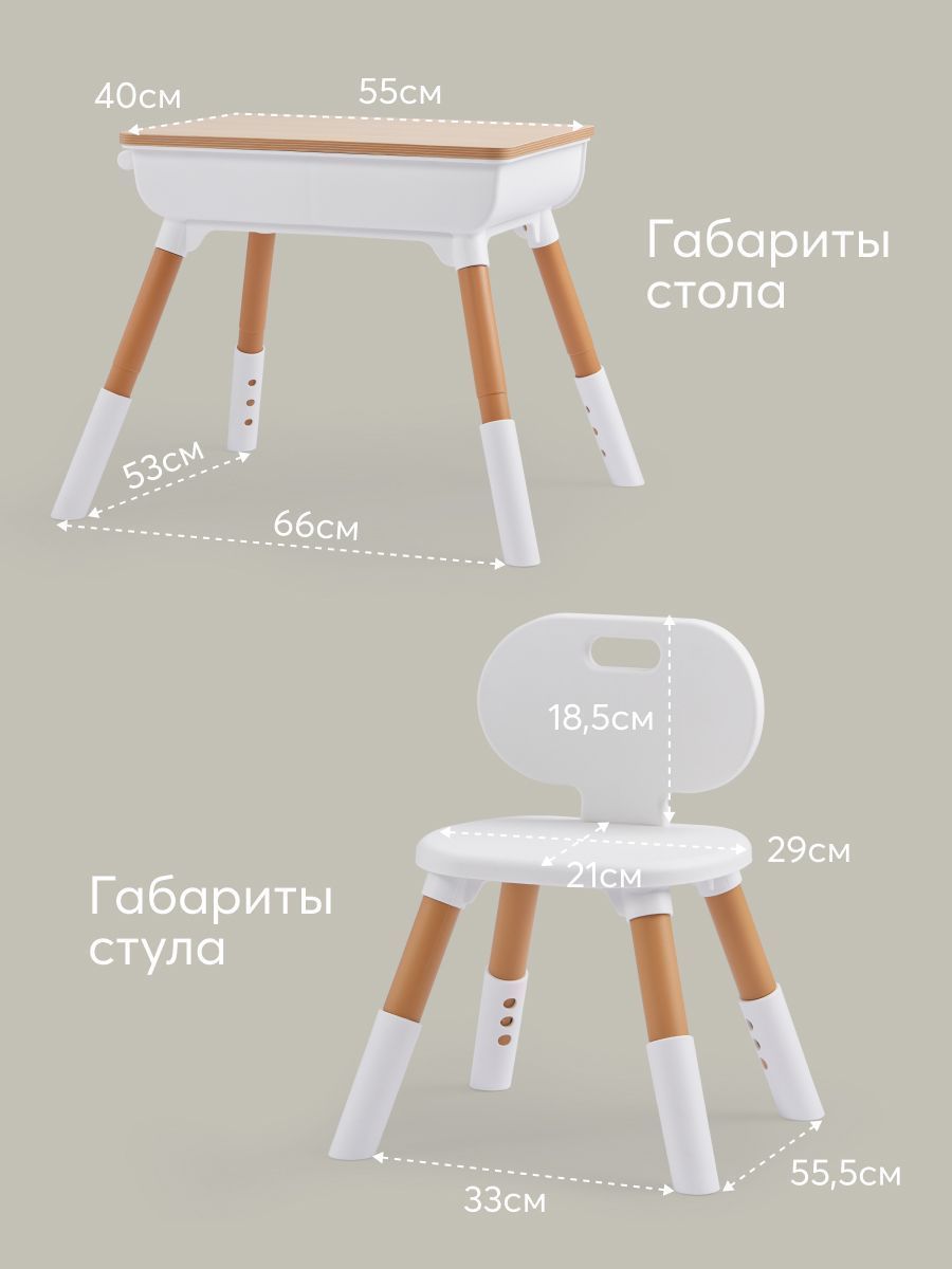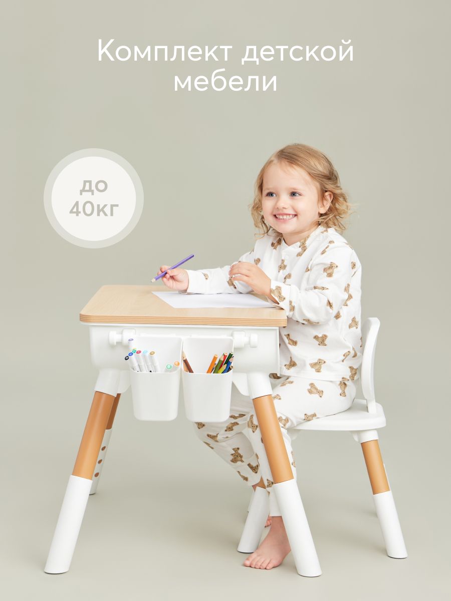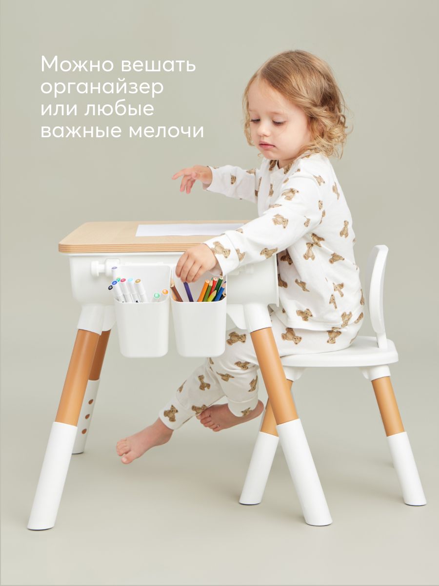 The furniture set is suitable for children aged one year and older. Proper sitting at the table is very important for children’s development. The height of the table, as well as the height of the seat, is adjustable, so you can always set the right position for your growing child. The dimensions of the table and chair are adjusted to be as comfortable as possible for children. The shape without sharp corners is specially designed to prevent the child from getting injured. The furniture design is made in calm natural tones. The set will fit perfectly into any interior and helps create a calm atmosphere in the children’s room.