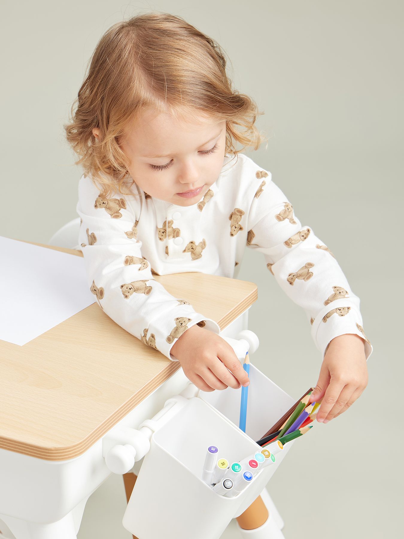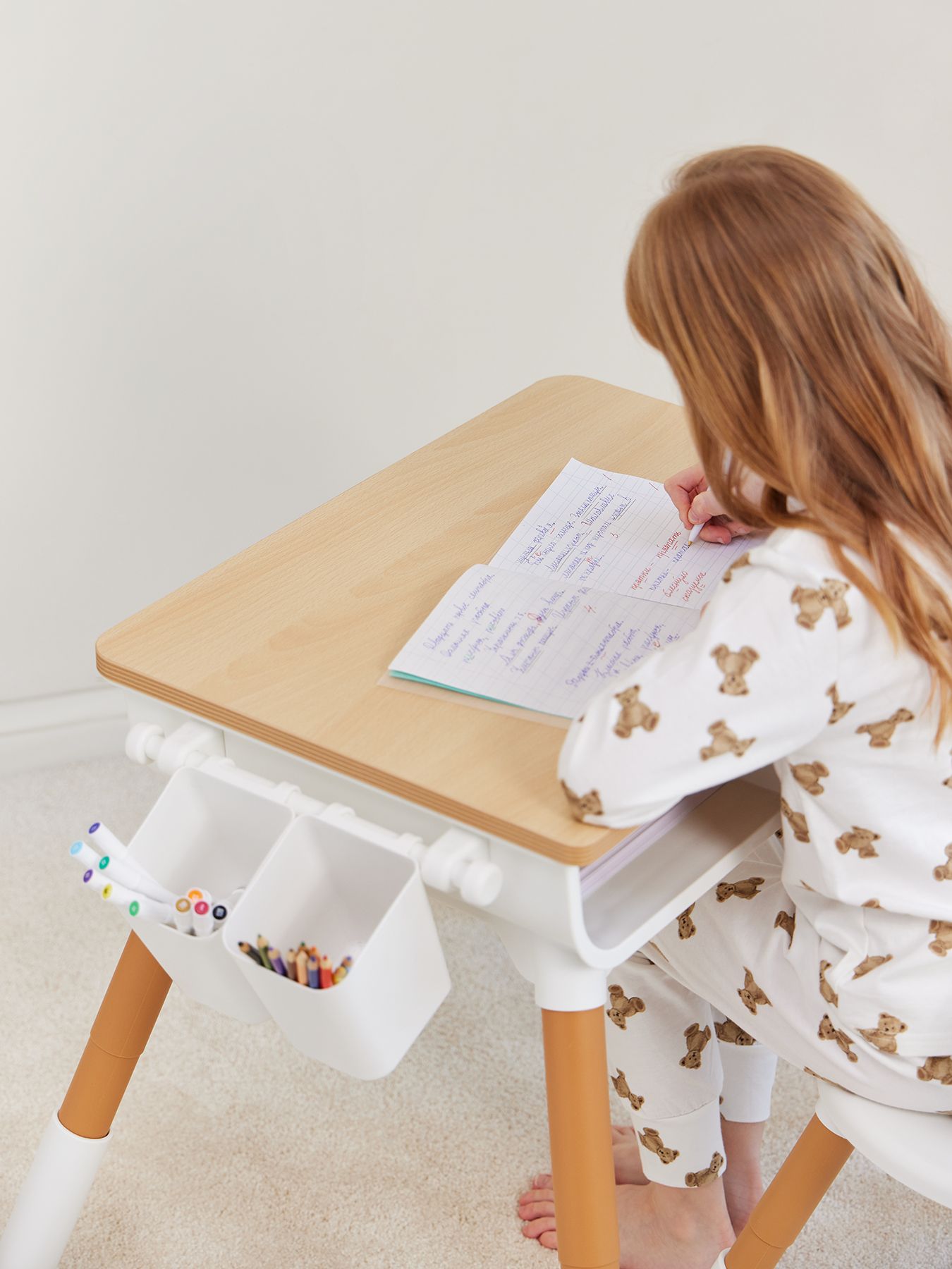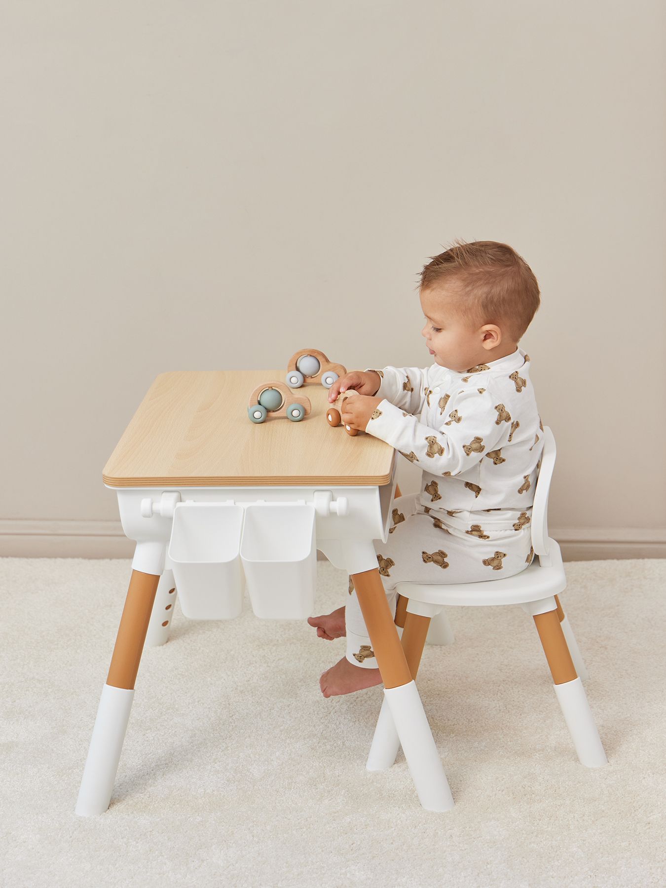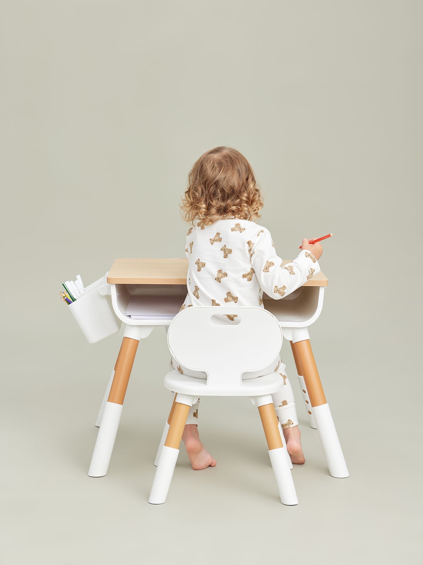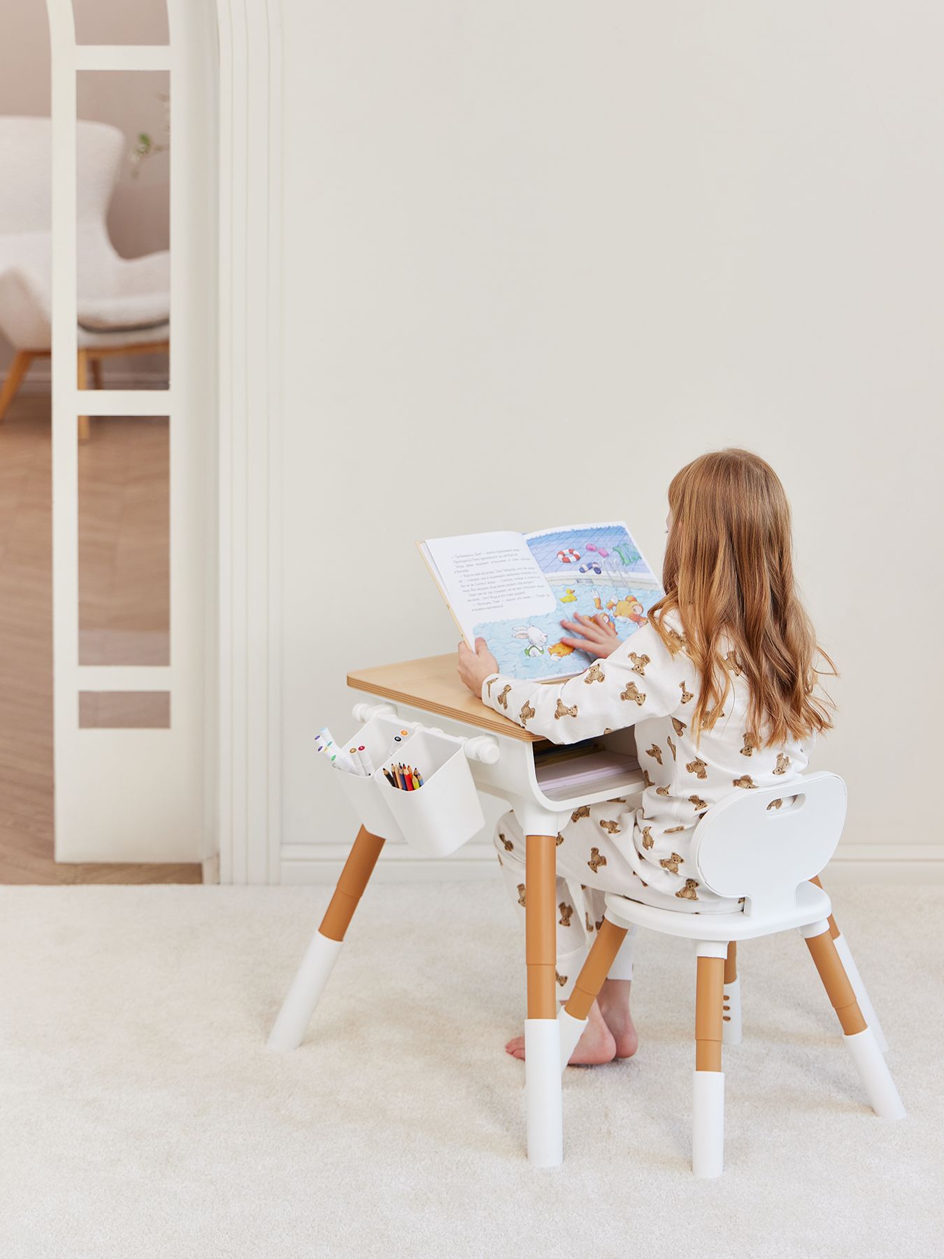 The furniture set is suitable for children aged one year and older. Proper sitting at the table is very important for children’s development. The height of the table, as well as the height of the seat, is adjustable, so you can always set the right position for your growing child. The dimensions of the table and chair are adjusted to be as comfortable as possible for children. The shape without sharp corners is specially designed to prevent the child from getting injured. The furniture design is made in calm natural tones. The set will fit perfectly into any interior and helps create a calm atmosphere in the children’s room.