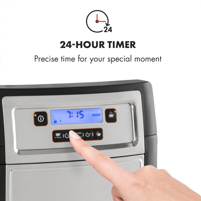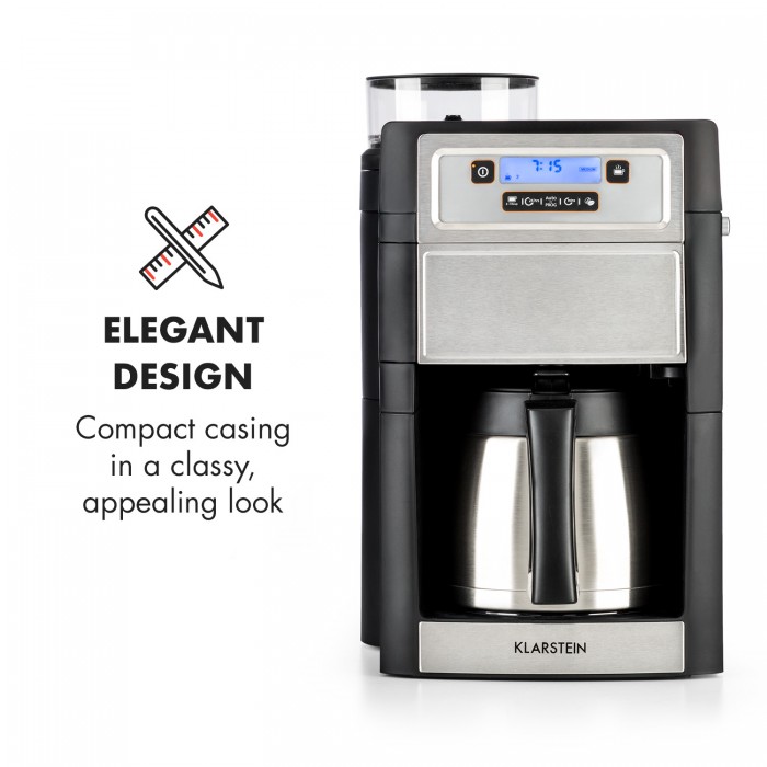 The Klarstein Aromatica II coffee maker will give you the incomparable pleasure of aromatic coffee. A special feature of the coffee maker is the built-in coffee grinder. Thus, one device can make coffee from both bean coffee and already ground coffee. With 5 selectable grind levels, from extra fine to coarse, you have the ability to customize the grind to your liking. The finer the powder, the stronger and more aromatic the coffee. Thanks to the built-in timer, the Klarstein Aromatica II coffee machine can prepare coffee at the time you specify. And thanks to its beautiful design and compactness, the coffee machine will certainly fit into the design of your kitchen.