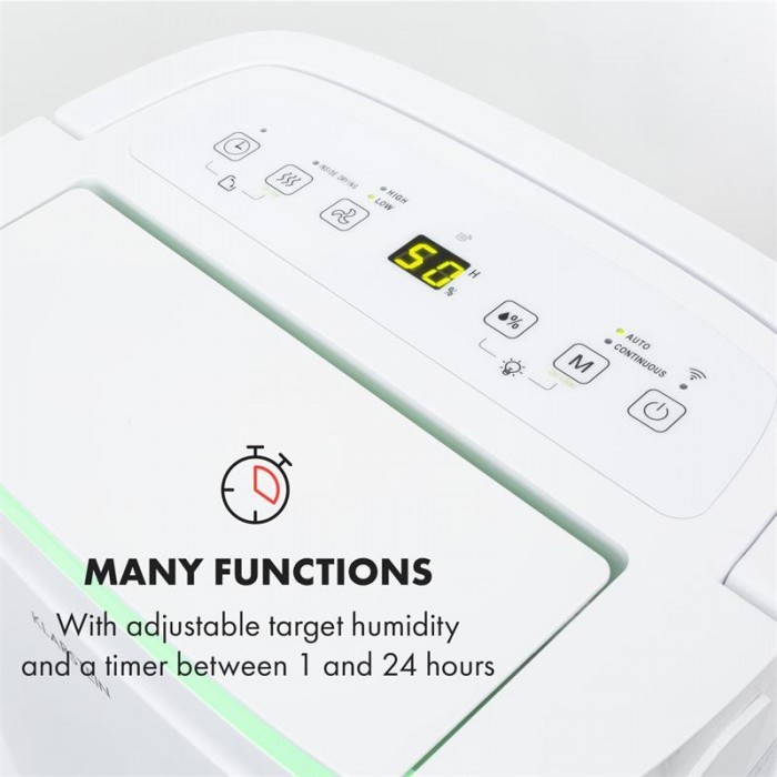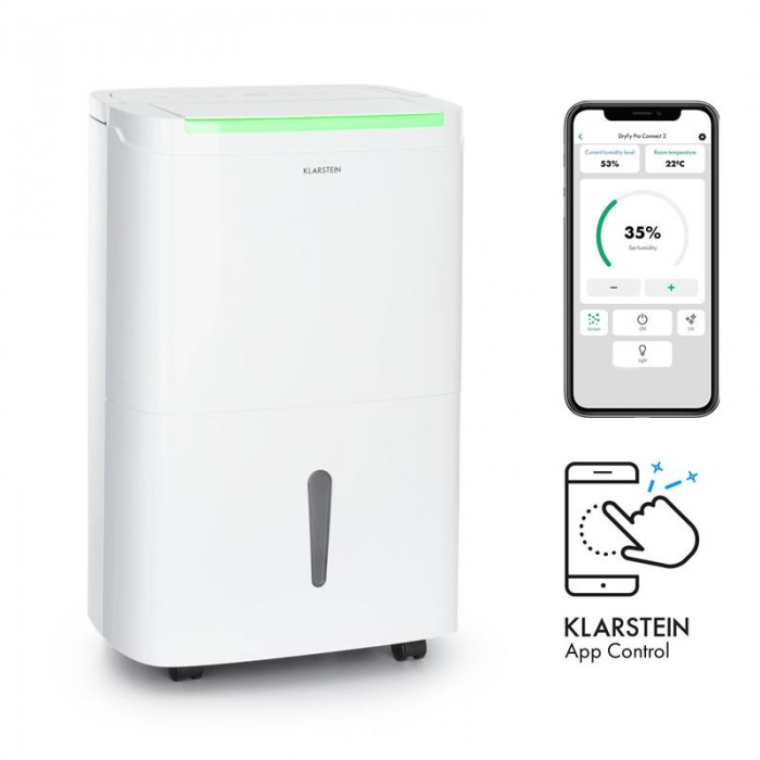 The Klarstein DryFy Connect 40 dehumidifier with WiFi interface dehumidifies damp areas after construction or renovation work and easily regulates the air humidity in kitchens, bathrooms or bedrooms. Klarstein DryFy 40 instantly removes moisture from the air and allows you to breathe freely. Thanks to an air circulation of 360 m³ per hour, it can remove up to 40 liters of water per day from the air. The Klarstein DryFy Connect 40 dehumidifier is therefore ideal for rooms between 35 and 45 m². The large 7-liter tank collects water and can be easily emptied when needed thanks to an audible alarm and an automatic shut-off that activates when full. Thanks to the Wi-Fi interface, it can be easily connected to your home network and controlled. The Klarstein DryFy Connect 40 can also purify the air thanks to its built-in activated carbon filter, which removes dust and odors, as well as small particles and germs from the air. Thus, one device improves the indoor microclimate. The device is also practical due to its ease of use: the screen located at the top allows it to be programmed using a few keys. This way, you can not only set a target humidity, but also program a timer in hourly increments.