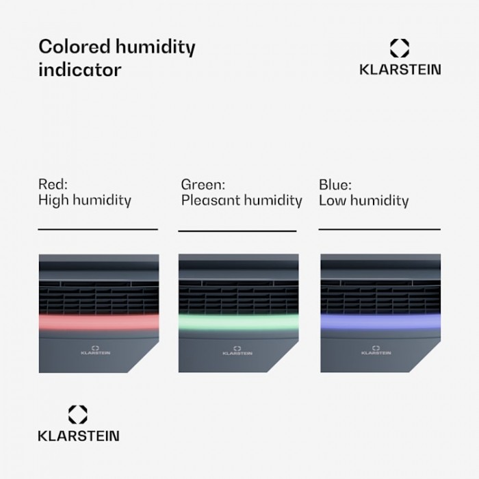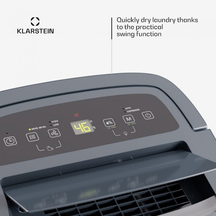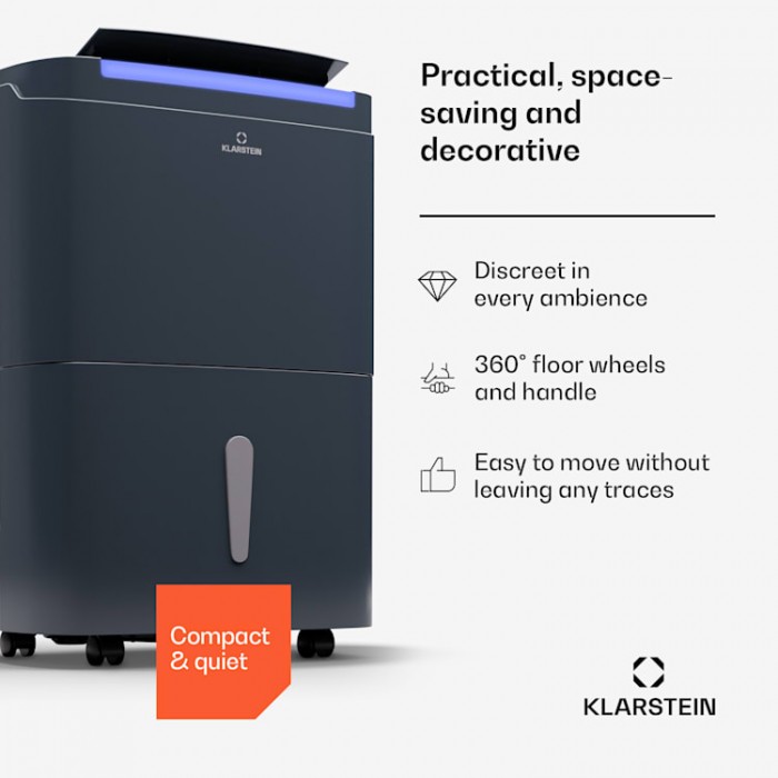 Klarstein DryFy Connect 50 instantly removes humid air and provides easier breathing in the kitchen, bathroom or bedroom, as well as rapid drying after construction or renovation work. With an air circulation of 360 m³ per hour, it removes up to 50 liters of moisture from the air per day – making the Klarstein DryFy Connect 50 dehumidifier ideal for rooms between 45 and 55 m². A large tank with a capacity of 7 liters collects accumulated water. Thanks to the Wi-Fi interface, you can conveniently control the device via the Klarstein app and conveniently program the timer. Achieving ideal humidity is easier than ever. The Klarstein DryFy Connect 50 dehumidifier provides better breathing air.