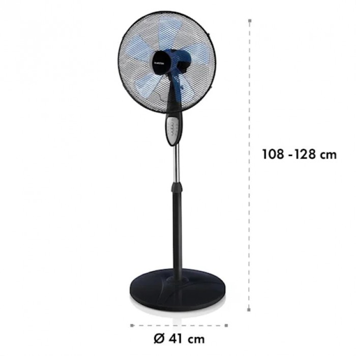 The Klarstein Summerjam fan enriches your summer life with cool freshness. Featuring a fan diameter of 16 inches (40 cm) and 5 powerful blades that can turn the power of its motor directly into air flow with a maximum output of 4150 m³/hour. 3 airflow speeds. Convenient height adjustment from 108 cm to 128 cm also provides refreshment for people of all heights. Control is simple and intuitive thanks to a convenient remote control and control buttons on the body. 50 W continuous operation ensures energy-saving and environmentally friendly use, and the fixed stand unit provides the necessary tip-over protection. In addition, a reliable and practical timer function is available, which provides convenient automatic shutdown of the fan at night.