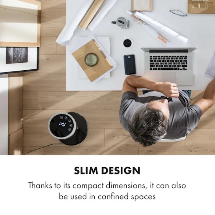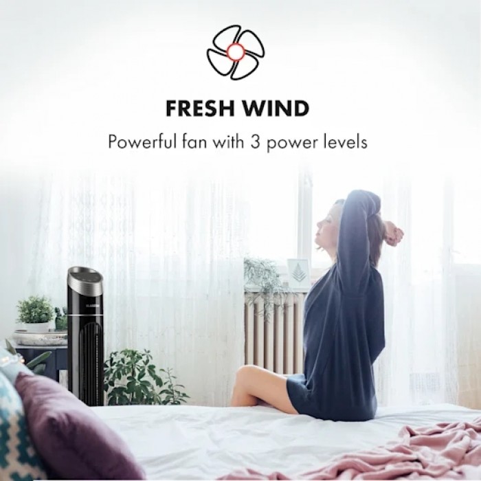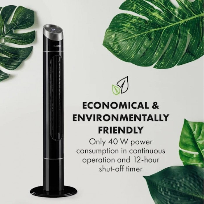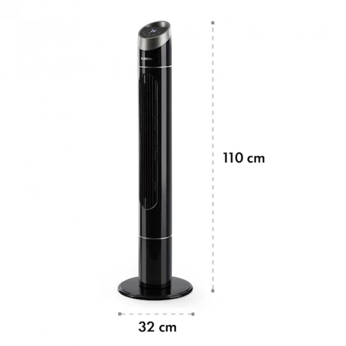 Klarstein 10032435 fan with 3 power levels, air flow up to 276 m³/h. Economical and efficient: power consumption during continuous operation of only 40 W, 12-hour shutdown timer. The fan rotates 75° around its axis, ensuring optimal ventilation of the room. Convenient control via remote control or touch control panel. Pure Ambience is a simple and aesthetic design that is suitable for both the living room and work area. The Smart Space concept is a compact tower design for use in any space.