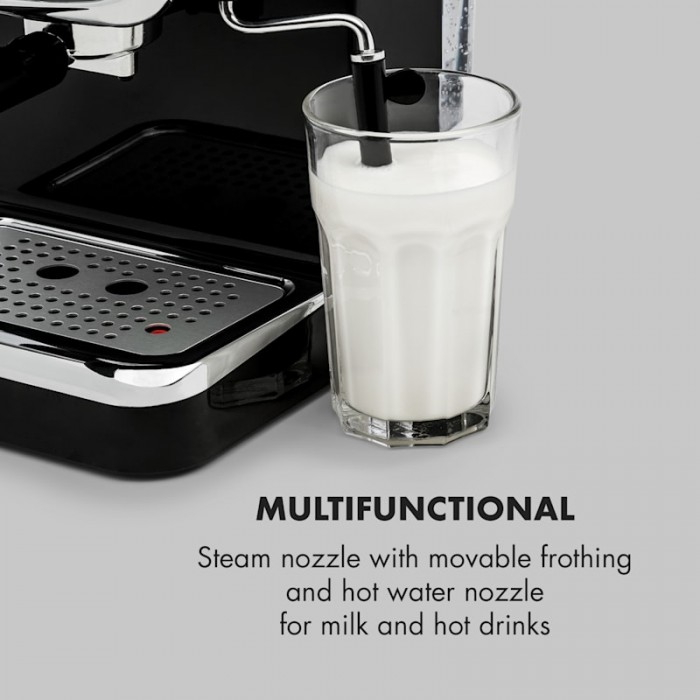 Espressionata Gusto forces hot water through ground coffee beans with a power of 1100 W and a pressure of 15 bar, thus revealing the full aroma of the coffee. The removable 1 liter water tank is easy to remove, fill and put back in again. Easy operation thanks to EasyBrewing technology. The highlight of the espresso machine is undoubtedly the large, retro-style temperature dial. Steam can be controlled via a large rotary dial, while the movable cappuccino frother and hot water nozzle instantly create frothed milk for cappuccinos or other drinks. Thanks to its unusual retro design, the Espressionata Gusto espresso machine from Klarstein is a striking highlight in every kitchen and always inspires with a freshly prepared coffee drink.