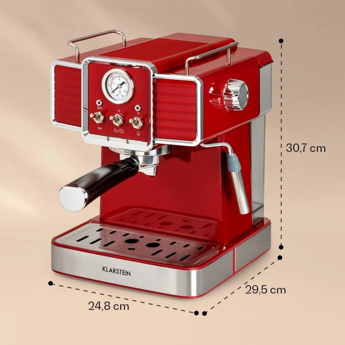 The Gusto Classico espresso machine from Klarstein not only captivates your palate with powerful, aromatic, freshly brewed coffee – the spectacle is also a real feast for the eyes. Feel the seductive aroma as the 20 bar espresso machine releases the full aroma of the coffee with its quirky retro design and 20 bar pressure. The espresso machine is suitable for both ground coffee and coffee capsules.