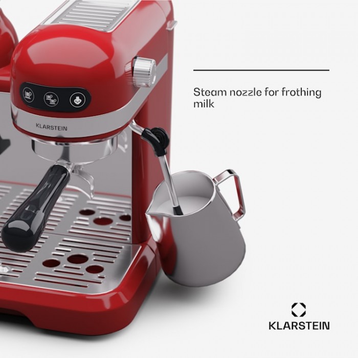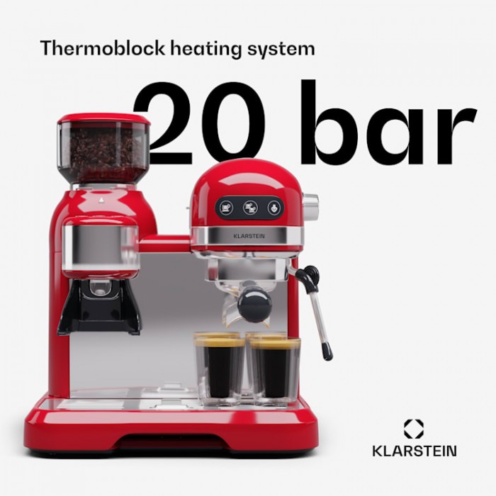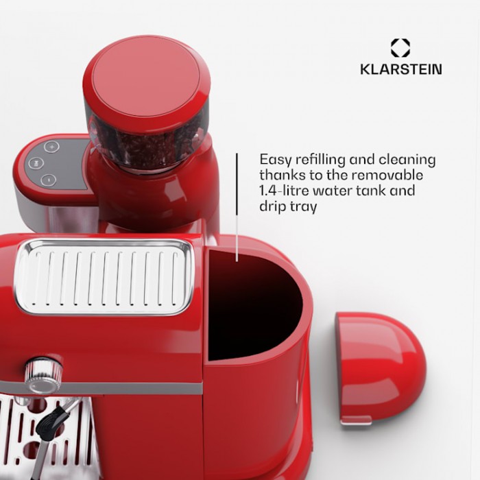 Full control and full taste: from grinding coffee beans to frothing milk: with the Bella Café espresso machine, everything is in your hands. The built-in coffee grinder with a capacity of 200 g can individually adjust the degree and time of grinding. The removable water tank can be filled with a capacity of 1.4 liters, allowing you to enjoy many refreshing moments in your daily life. The advanced Thermo Block rapid heating system heats water quickly, so your espresso is ready in minutes. One or two: the pouring device is designed for 2 cups. The required amount of coffee can be determined at the touch of a button. Thanks to the anti-drip function, the water does not overflow. The drink here is also at the right temperature, since the cups can be heated at the top of the device. The exquisite pleasure of coffee is complemented by foam. The Bella Café espresso machine from Klarstein is equipped with a movable milk frother. This results in the formation of particularly resistant foam under high pressure. Cappuccino and latte macchiato are also prepared at barista level. A quality espresso machine with portafilter not only provides refreshing moments of pleasure, but also makes everyday life easier thanks to convenient operation. It can be cleaned quickly and the drip tray and milk spout are easy to remove. It is also very safe and reliable: it has protection against overheating and overpressure. The slim and elegant 1950s design matches the kitchen perfectly.
