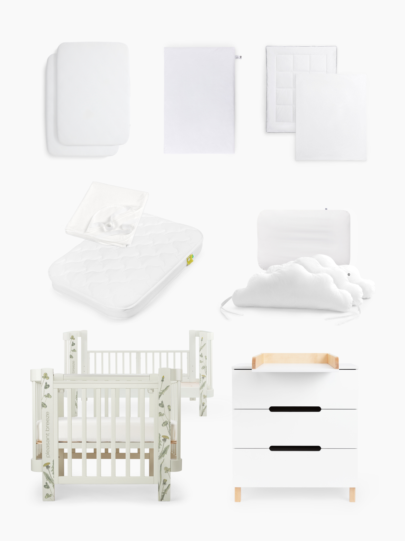 The set of 9 items includes: • Chest of drawers FIOKI V2 • Transformable crib MOMMY LOVE • Mattress for the cradle MOMMY LOVE 100×70 cm • Children’s mattress pad 100×70 cm • Set of bumpers for the crib, 3 pcs • Children’s pillow • Children’s blanket • Set of dividers for boxes, 2 pcs. SORTLINE “SORTLINE” • Bed linen set (duvet cover and pillowcase) • Fitted sheet 100×70 cm, 2 pcs Chest of drawers with changing table FIOKI V2 Article: 91037 Quantity in set: 1 pc Color: white Composition: MDF, natural wood Chest of drawers Fioki V2 will become an important part of your children’s room. Despite its compact size, it provides spacious storage of all the necessary things for the baby: care products, diapers, clothes and bedding. The drawers open easily and silently without disturbing the child’s sleep, and the legs made of natural wood give the chest of drawers additional stability. The removable changing table makes caring for your baby even easier and more convenient, and its sides provide additional safety.