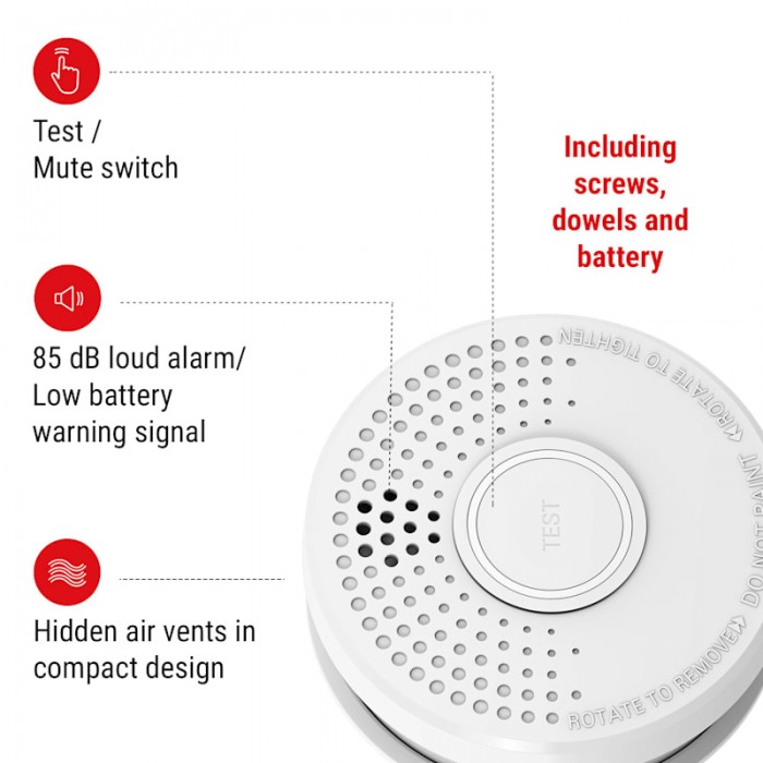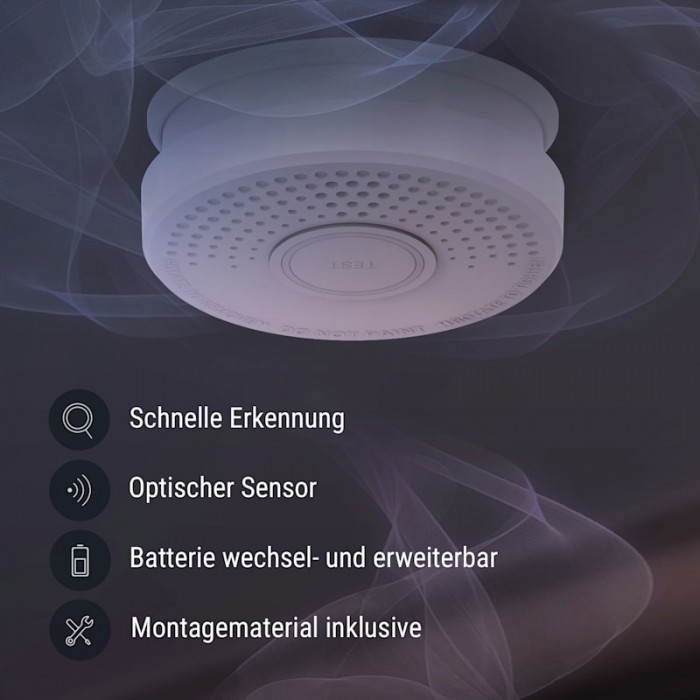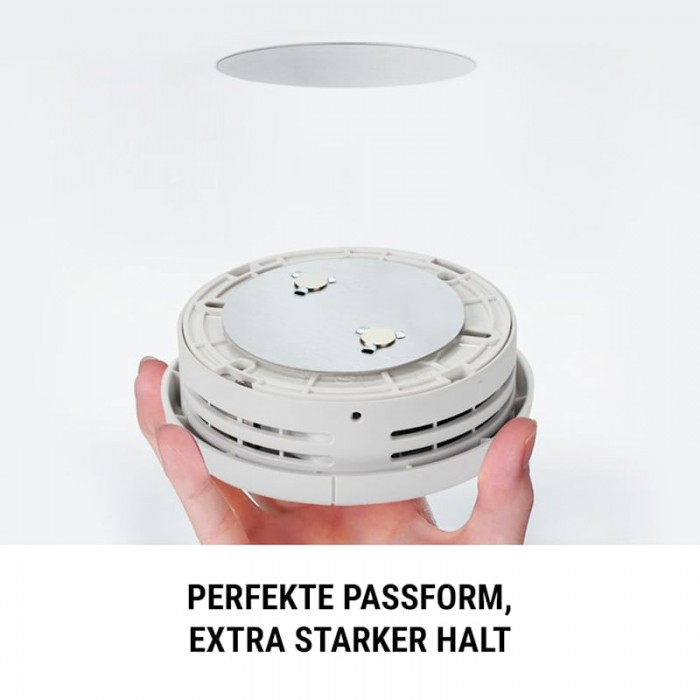 A fire alarm within your own four walls not only saves lives, but is also mandatory. The DOF39 smoke detector from SHD from oneConcept meets all the mandatory requirements and is therefore a good and affordable choice for your entire apartment, office building or home. With an 85 dB warning signal, the SHD by oneConcept smoke detector can wake you up while you sleep. A self-adhesive magnetic ceiling mount is included, so no drilling or screwing is necessary. Two strong neodymium magnets hold the DOF39 fire alarm in place. The self-adhesive magnetic mount also allows for functional tests, battery changes and easy device replacement. The device does not require special wiring.