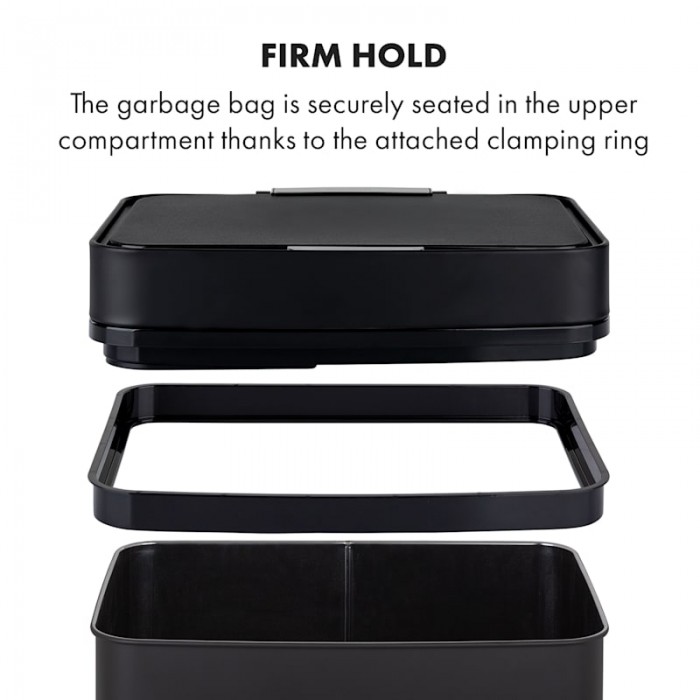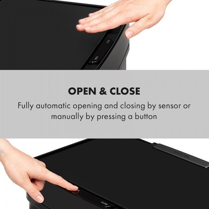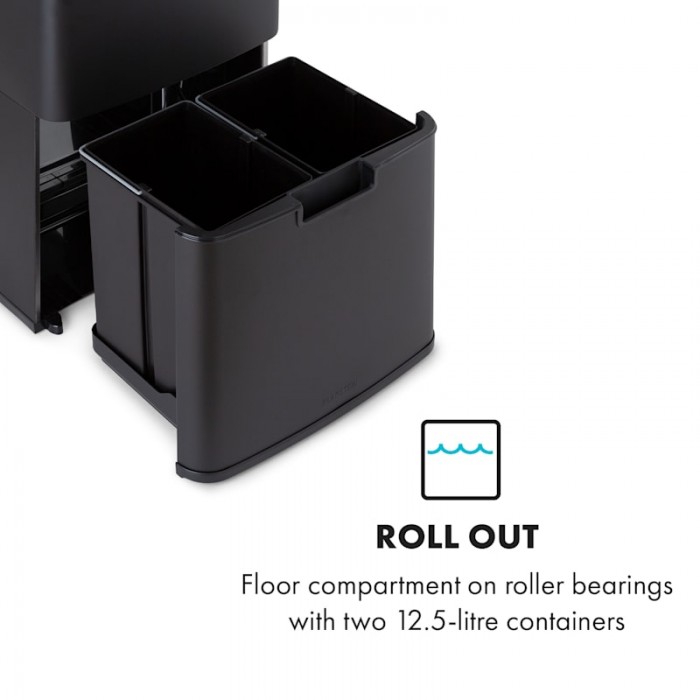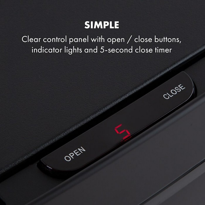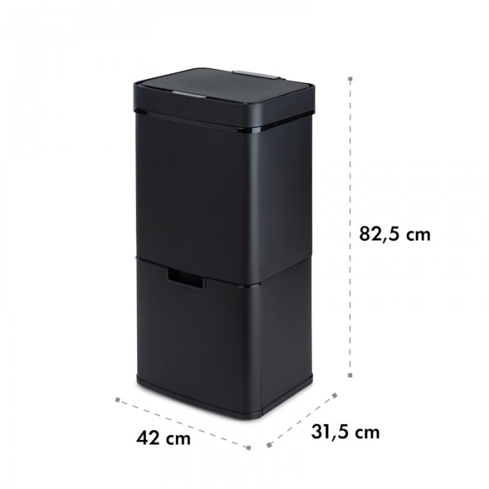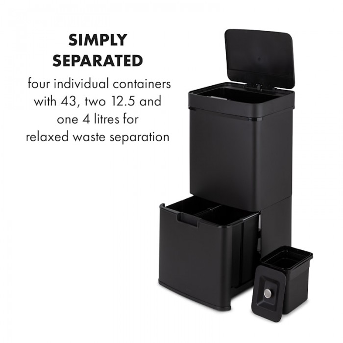 Royal Trash Matte Black from Klarstein has impressive features: automatic lid opening sensor, elegant stainless steel housing and 4 different containers. The Klarstein with a capacity of 72 liters has a large container of 43 liters as well as 2 recycling containers of 12.5 liters each. In this way, for example, bulky recycling waste, residual waste and paper can be separated directly at disposal. Particularly practical is the 4-liter bin, which can be used to dispose of organic waste and which, thanks to its lid, has additional odor protection. The use of the upper compartment is completely contactless. Thanks to the sensor, its lid opens fully automatically as soon as you reach a distance of 20 cm. The lid closes automatically 5 seconds after something is thrown inside. If necessary, the lid can also be opened and closed again by pressing a button. 2 x 12.5 liter recycling bins are located in a drawer on ball bearings and can be easily pulled forward and backward. The sleek stainless steel body is not only elegant, but also fingerprint resistant. Indicators on the control panel also provide reliable information about the status of sensors and battery charge level, and the Soft Close Lid mechanism ensures silent opening and closing of the lid. The Klarstein waste bin is also equipped with a clamping ring that ensures a secure fit for the waste bag.