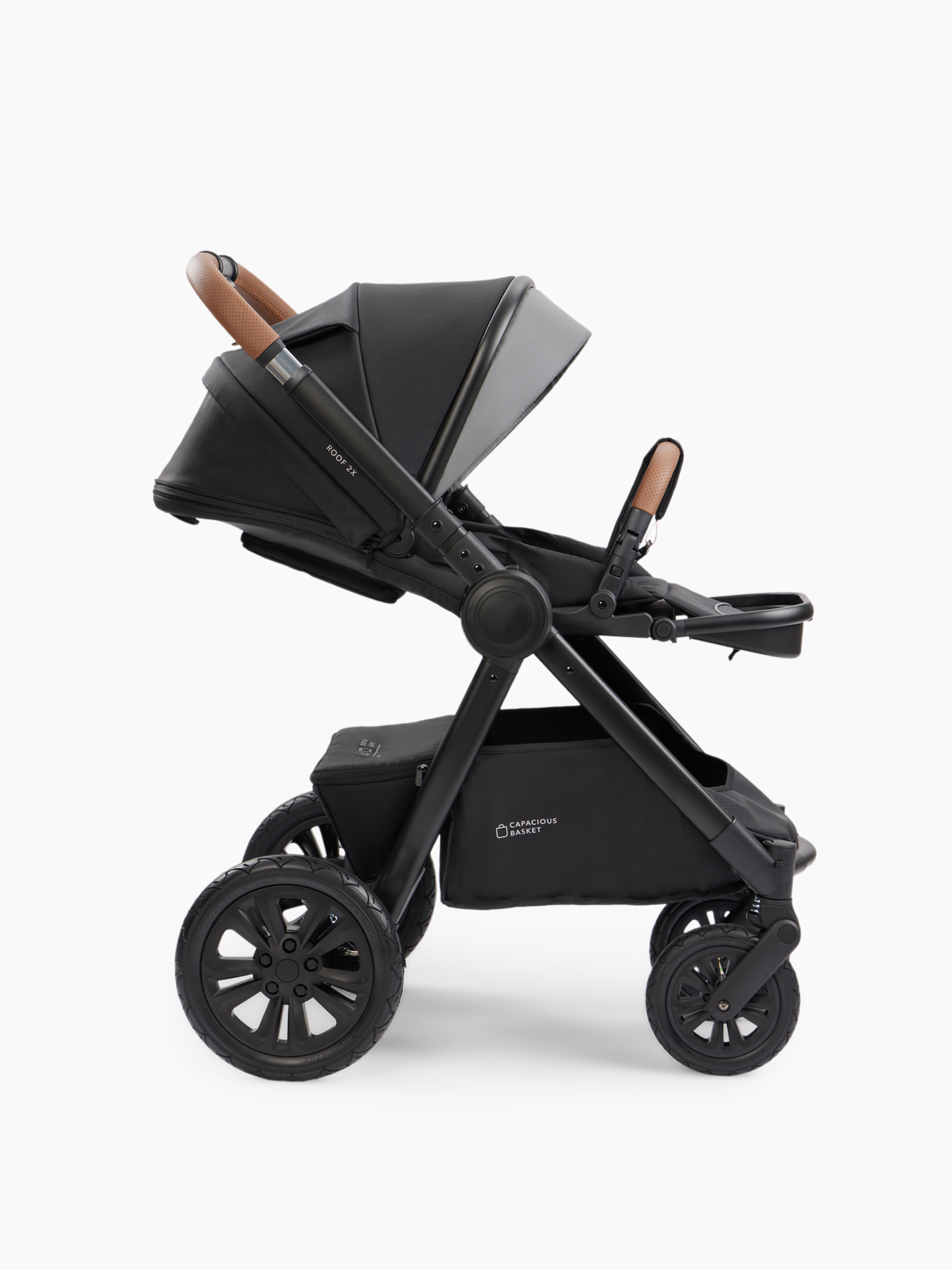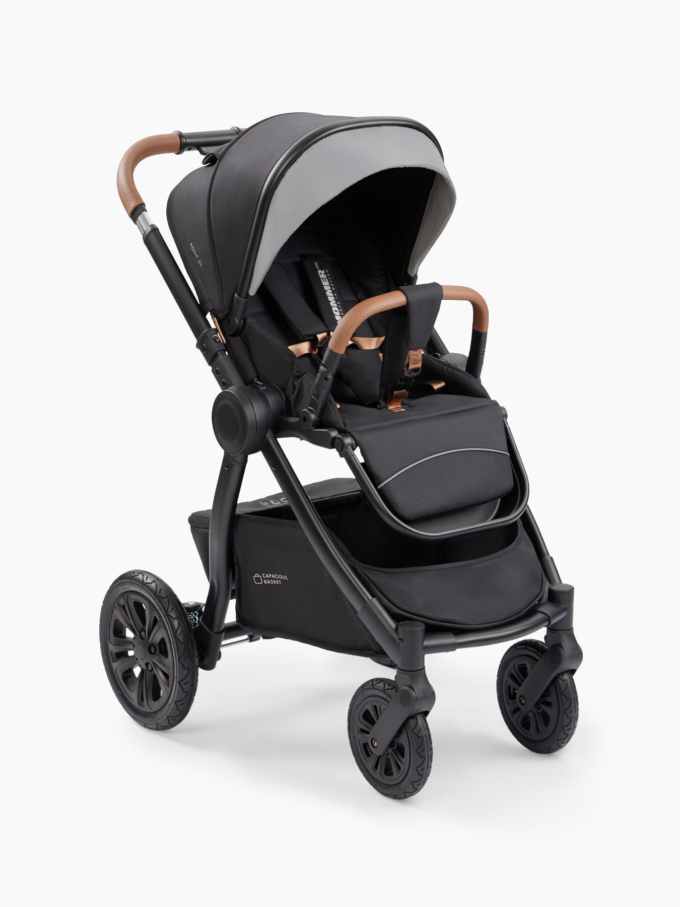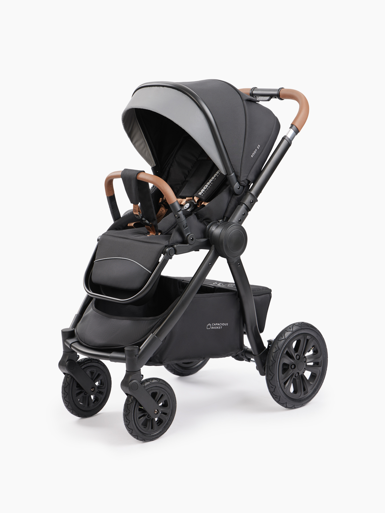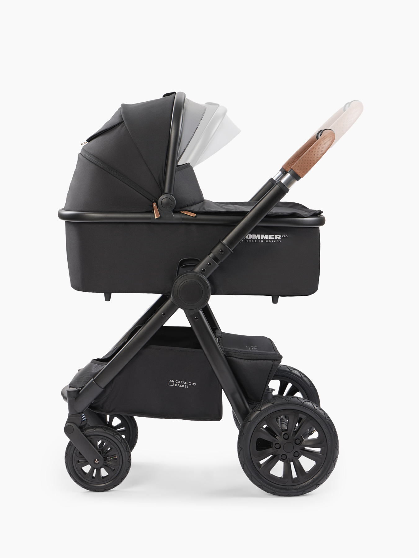 MOMMER PRO is a 2 in 1 stroller for children from birth, equipped with a spacious cradle and a comfortable seat block. The cradle block for newborns is equipped with a convenient carrying handle. A large hood will protect you from the sun, and a viewing window will help you keep an eye on your child. The walking block is equipped with a hood up to the bumper. A bumper with a leg divider and five-point harnesses with soft pads securely secure the baby in the stroller. The angle of the block, the position of the backrest and footrest can be adjusted. The walking block is installed facing the parents or in the direction of travel. Walking with MOMMER PRO is convenient for both mom and dad – the telescopic handle can be adjusted to the desired length. Shock absorption on the rear and front wheels will provide comfort even on off-road conditions. Reliable rear wheels with rubber tires and EVA foam filling do not need to be pumped up. A large basket will accommodate purchases and everything you need for walking. With MOMMER PRO, the baby’s comfort and safety are under control.