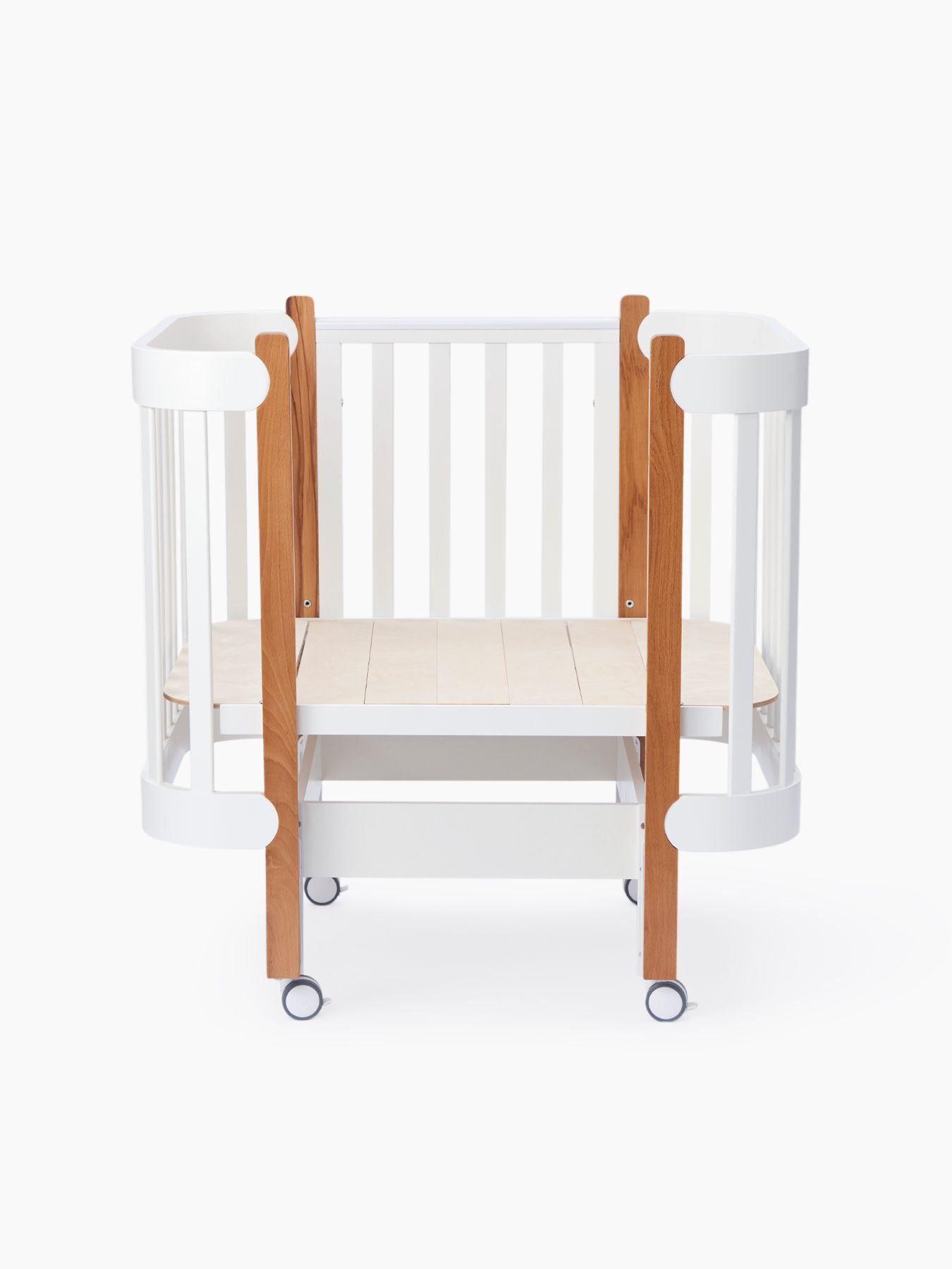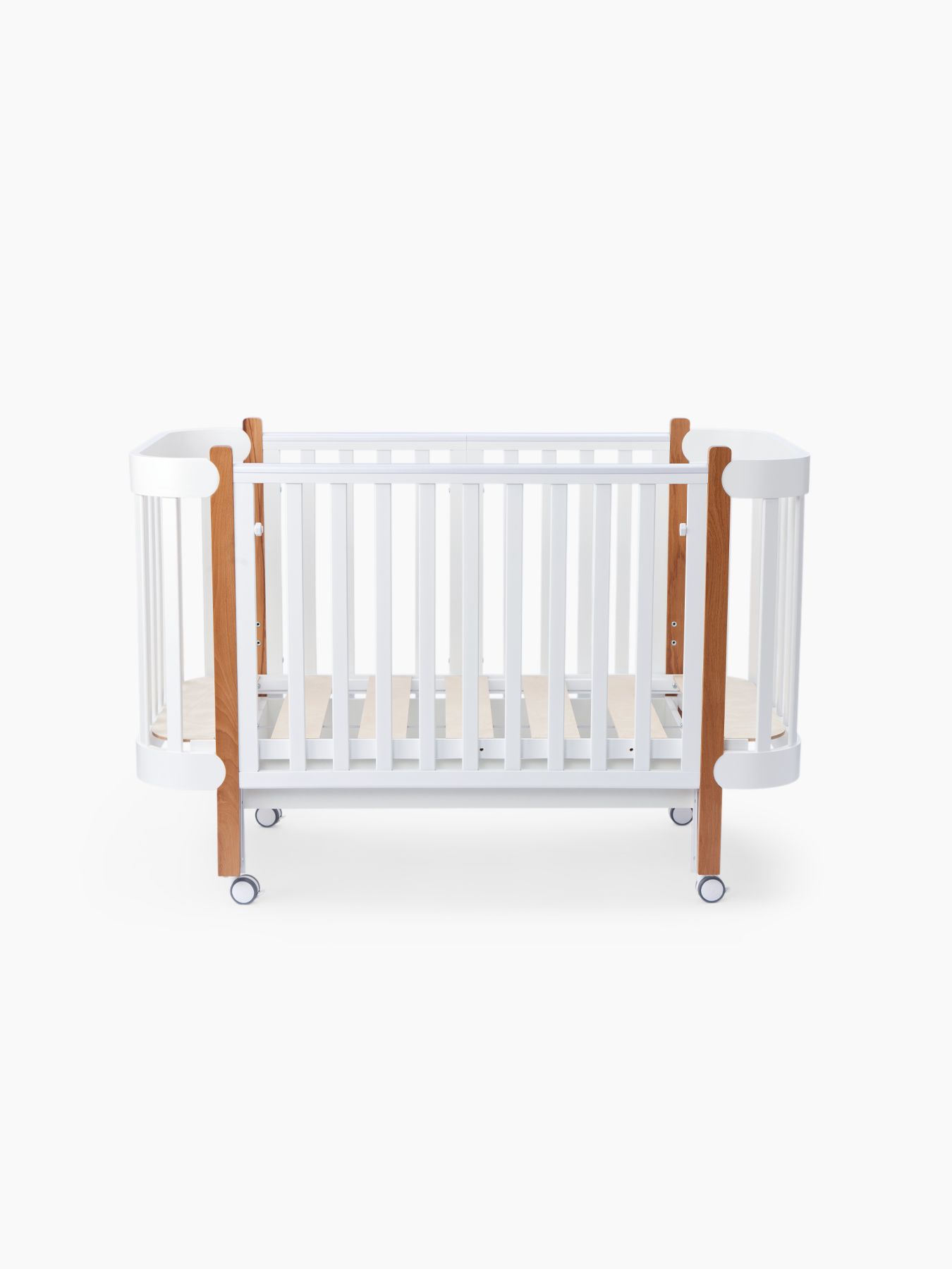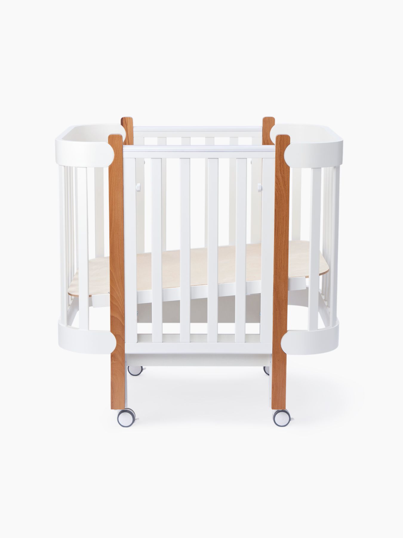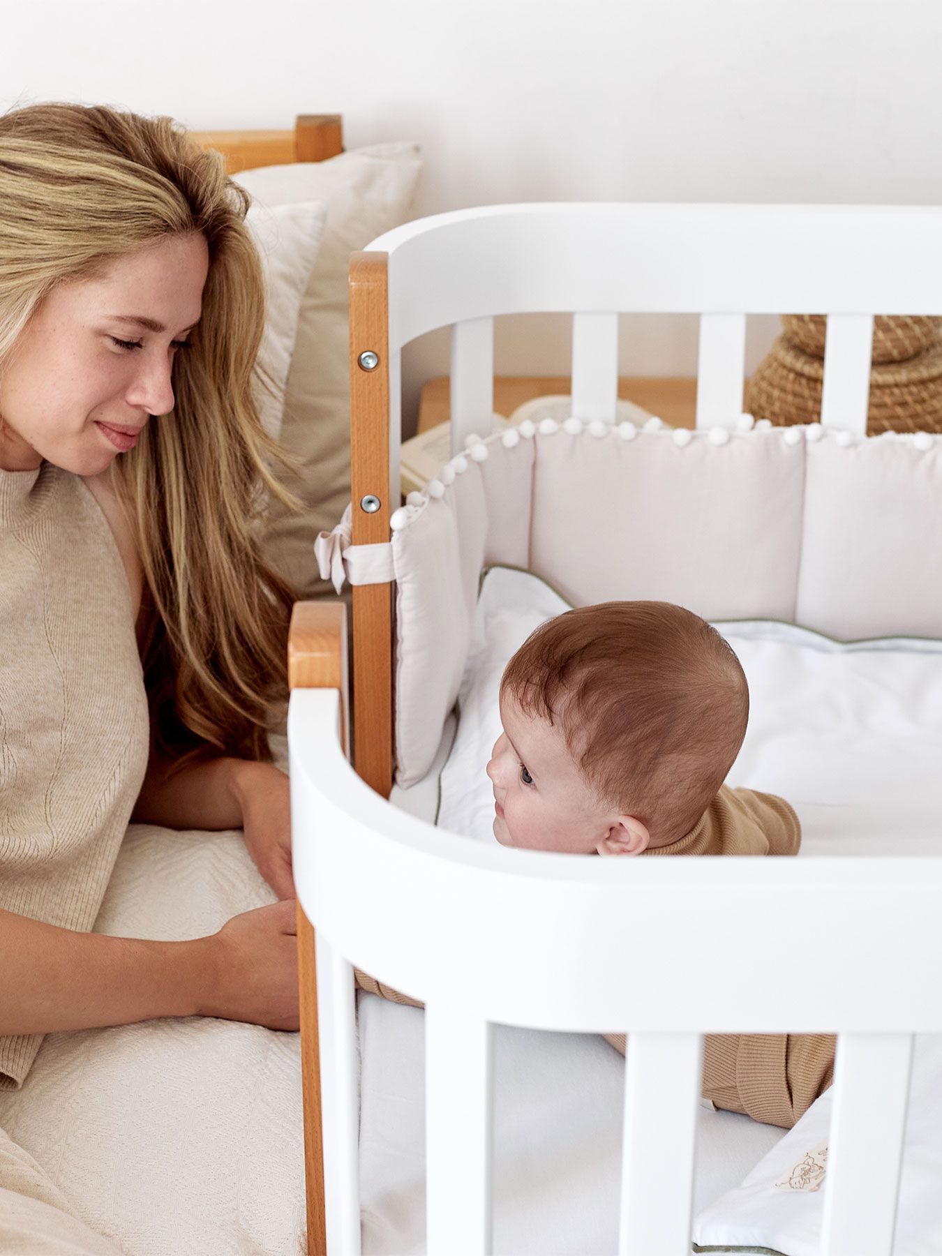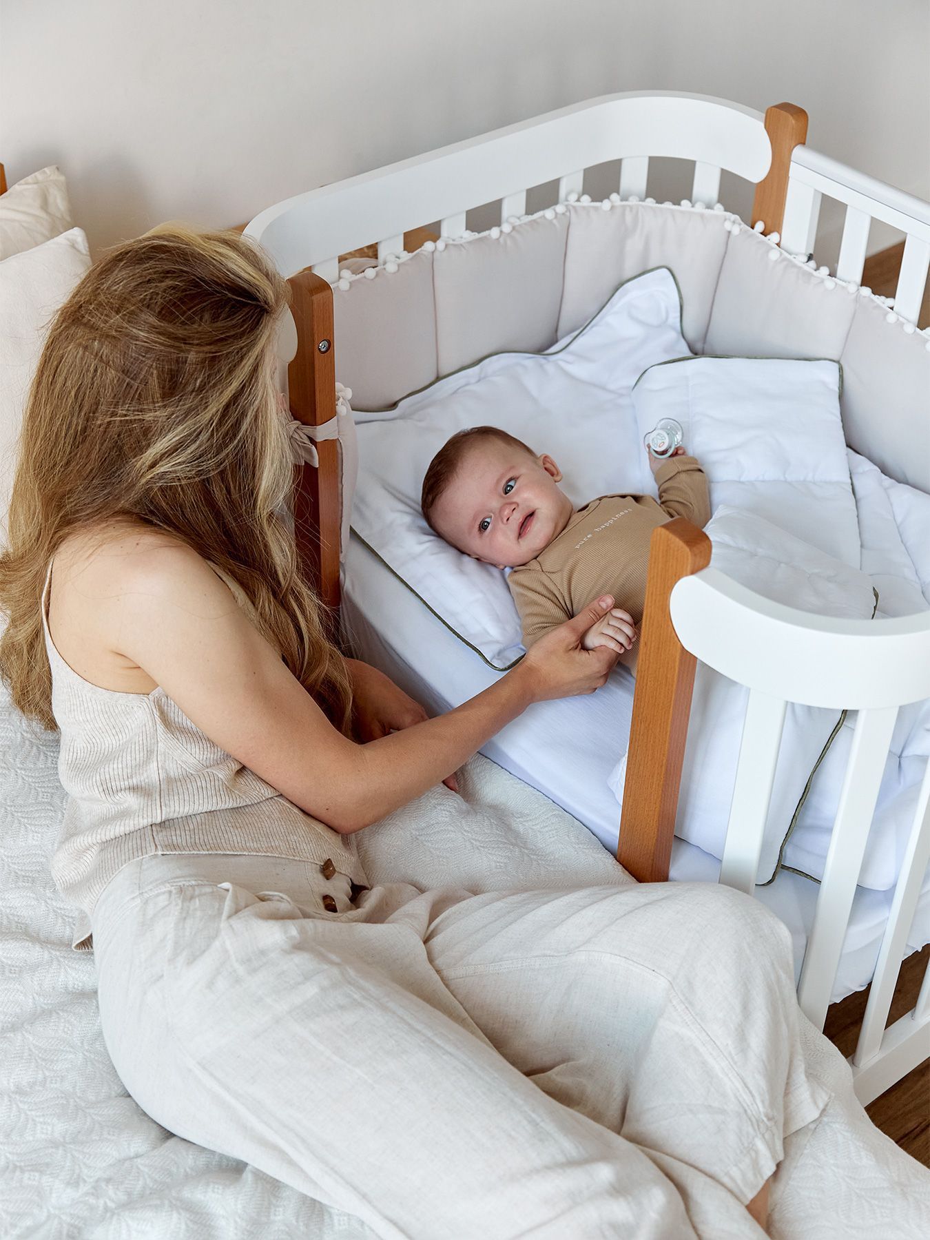 Thanks to simple lines, natural materials and innovative solutions, the MOMMY LUX hb™ baby crib will be a cozy place for your baby from birth. The crib comes complete with a cradle pen and an extension kit. The cradle gives you the opportunity to feel and see every breath of the baby – just remove the partition and move the cradle close to the parents’ bed. To prevent the bassinet from moving away from the adult bed, two fixing straps are included in the kit. It will be convenient for you to feed the baby, check your well-being, adjust the blanket or shift the baby after feeding, and the baby will feel safe next to his mother. A unique feature of the MOMMY LUX hb™ crib is the ability to tilt the bottom, which will prevent accidents associated with the baby’s natural belching during sleep. Ease of use is also ensured by the slatted bottom with the ability to be installed in 4 height positions. The pendulum for the cradle provides the baby with the sweetest sleep, simulating natural rocking as in the arms of a mother. The pendulum can be used in the “cradle” position and in the “crib” position – an extension is also provided for the pendulum. Thanks to this, the baby falls asleep faster and sleeps more soundly compared to a regular crib. The kit includes clamps that prevent spontaneous rocking when the baby turns over in his sleep or wakes up after a sound sleep. The expansion kit allows you to expand the bassinet to a full-size crib. The sides are equipped with polypropylene pads to protect the baby and the crib during teething. For older children, one of the sides of the crib can be replaced with a limiter in the form of a cute cloud, which will decorate the interior of the bedroom. MOMMY LUX hb™ was created with the participation of experienced mothers using exclusively high-quality materials – durable and easy to care for. We care about the comfort of children and parents.