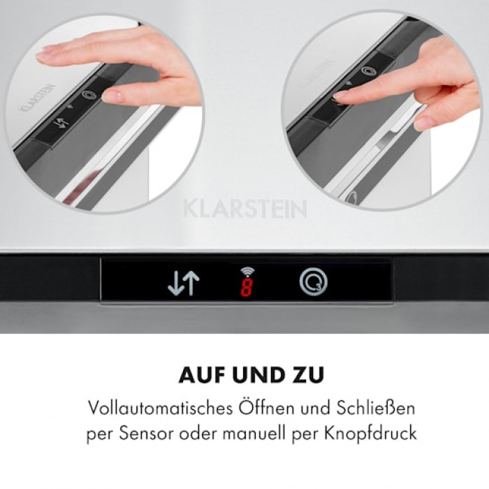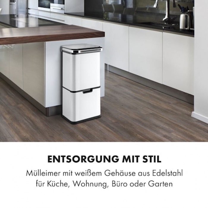 Touchless ultra-clean sensory trash bin 60L for 3 containers. The Klarstein Touchless Ultraclean impresses with ozone sterilization, various containers for organic and household waste and a practical odor filter. The Klarstein Touchless Ultraclean waste container with its spacious 60-litre interior offers two separately removable containers for organic and household waste, as well as a large recycling bin with an additional divider. For example, residual waste, organic waste, paper and other types of recycling. Thanks to the BacteriaEraser function, 90% of bacteria and viruses can be reliably destroyed in just one minute using ozone sterilization. In combination with OdorControl and the odor filter integrated in the lid, Touchless Ultraclean ensures maximum hygiene in the kitchen, apartment, office or garden. The two upper bins can be filled contactlessly: thanks to the sensor, the lid opens fully automatically as soon as you bring your hand within the range of the sensor from a distance of about 20 cm. Throw away the garbage and after 5 seconds the lid will automatically close again. If necessary, the lid can be opened and closed again at the touch of a button. The large waste basket sits in a drawer on casters and is moved back and forth by a handle. Practical floor casters also make the smart waste bin easy to move. With its white stainless steel housing, Touchless Ultraclean fits perfectly into any living environment.