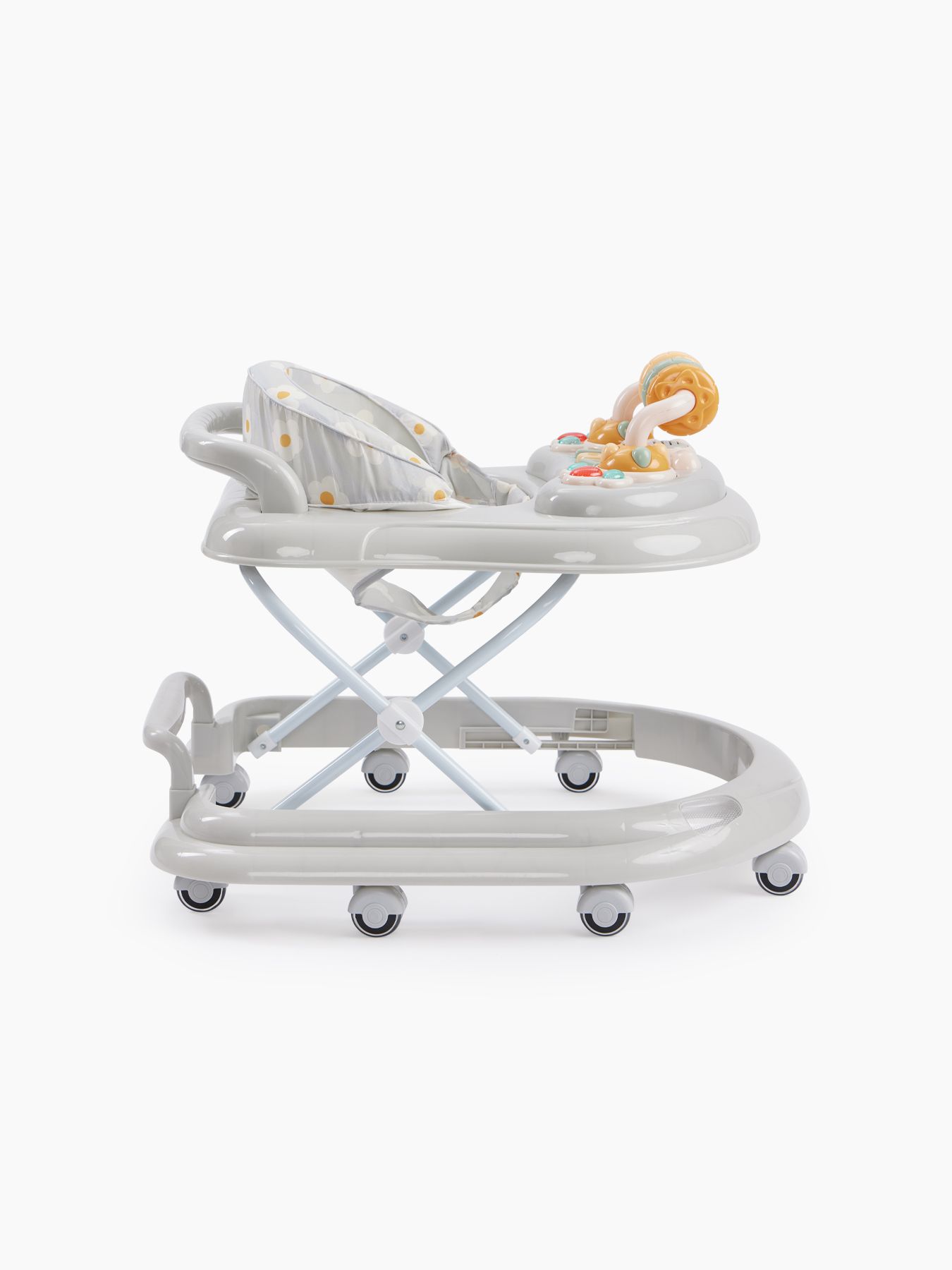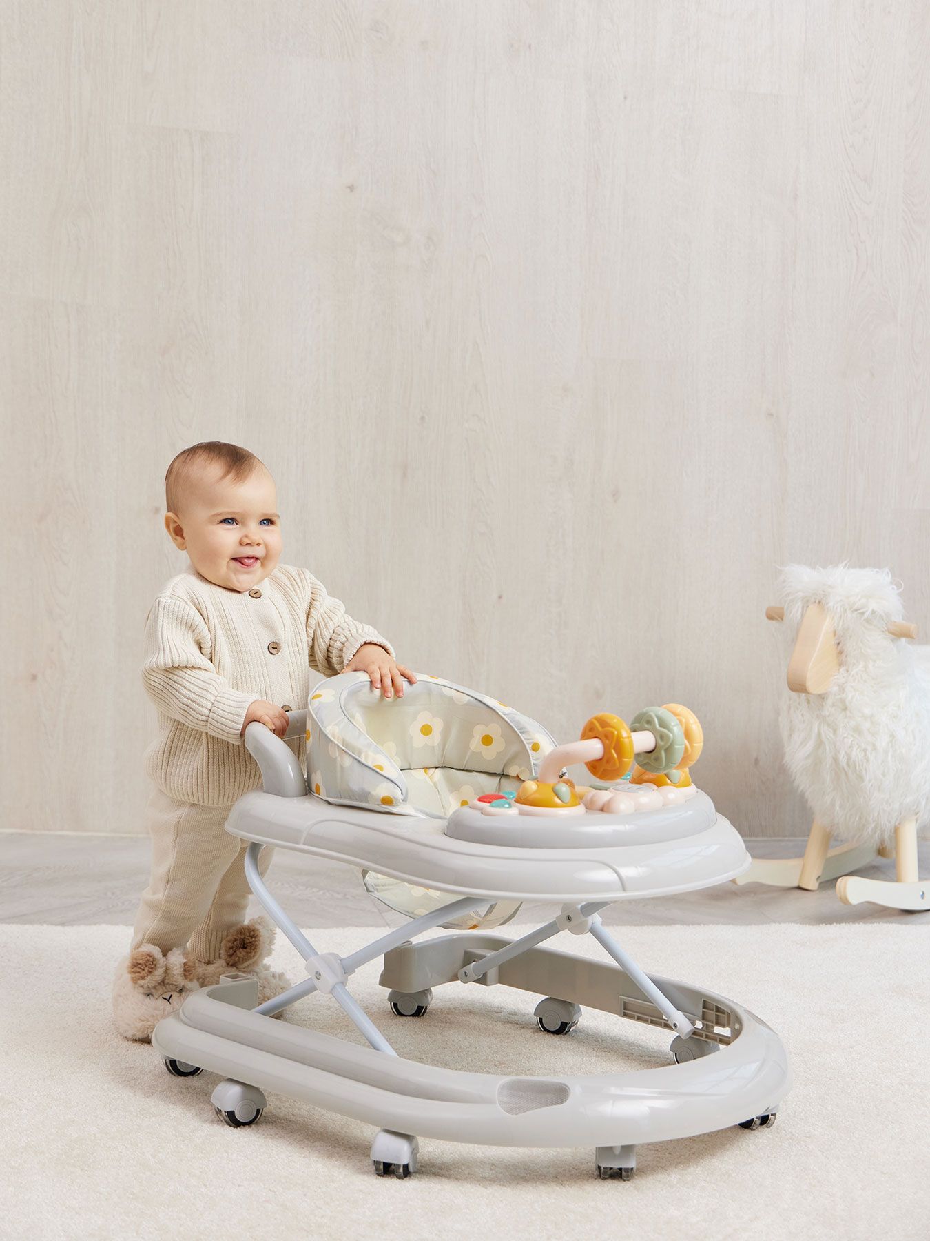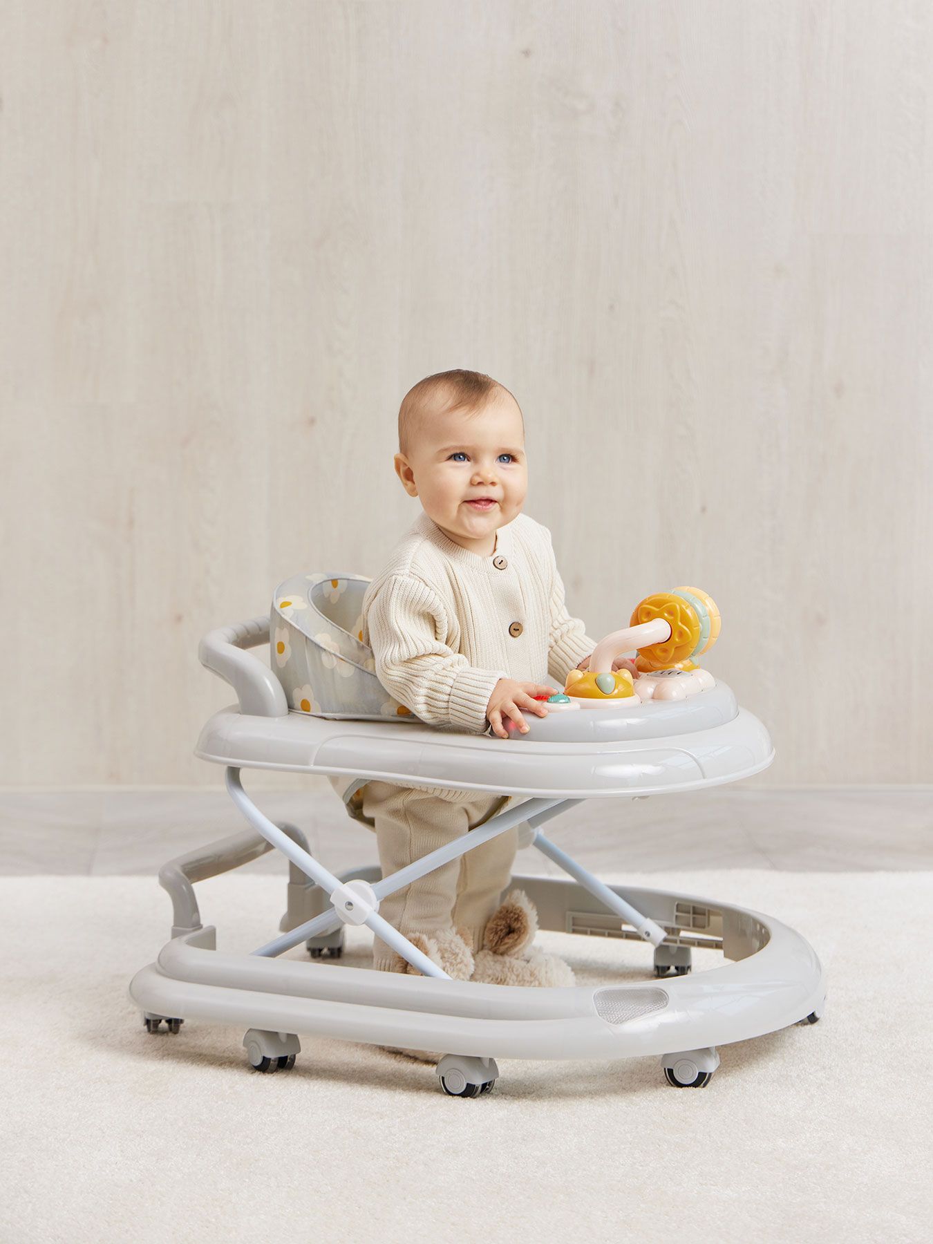Classic walkers SMILEY V2 develop coordination of movements and will help the child learn to maintain balance. The soft colors of the walker will attract the baby’s attention. A play panel with sound effects and toys will help develop your baby’s vision, hearing, grasping reflex and fine motor skills. The soft, comfortable seat is easily adjustable in 3 positions depending on height. SMILEY V2 walkers are equipped with special silicone wheels that will not scratch the floor covering. The game panel runs on 2 AA batteries.